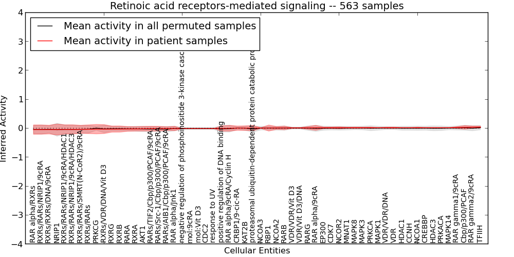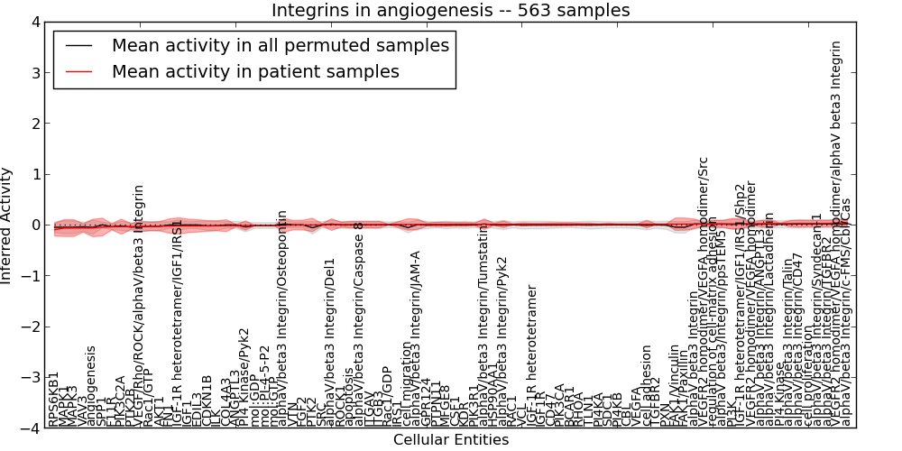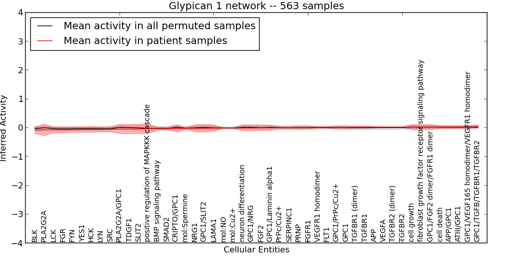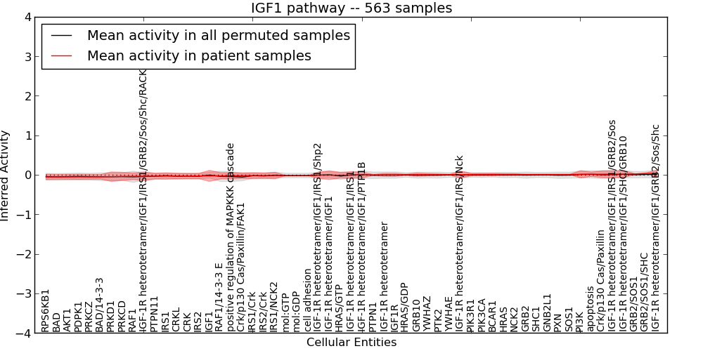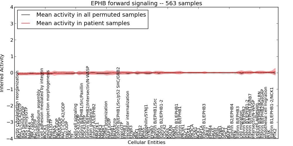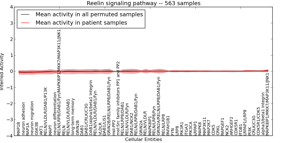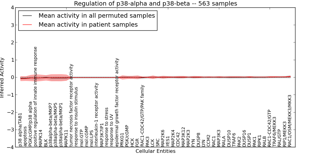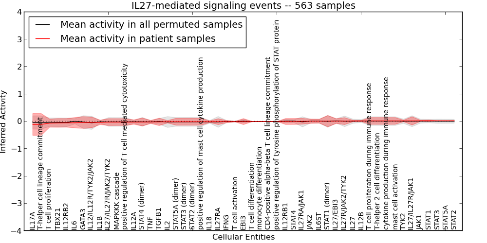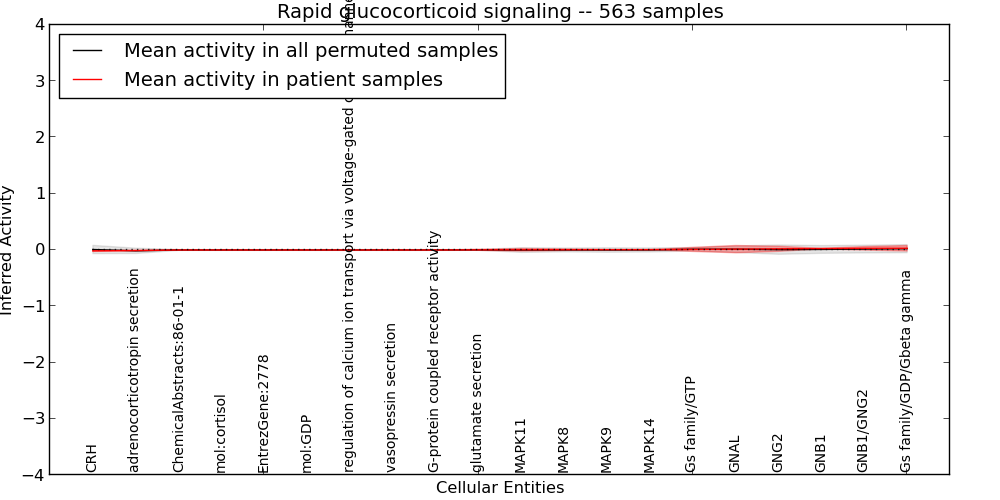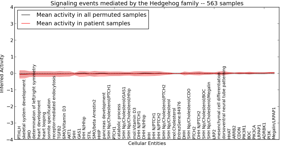Figure S128. Get High-res Image This plot shows pathway concept perturbations across all samples against a permutation model. The concepts along the x-axis are sorted by lowest to highest mean activity for the real patient samples. Mean inferred activities are plotted along the y-axis as a colored band showing the average level and one standard deviation range. Real samples are shown in red and permuted samples in black.