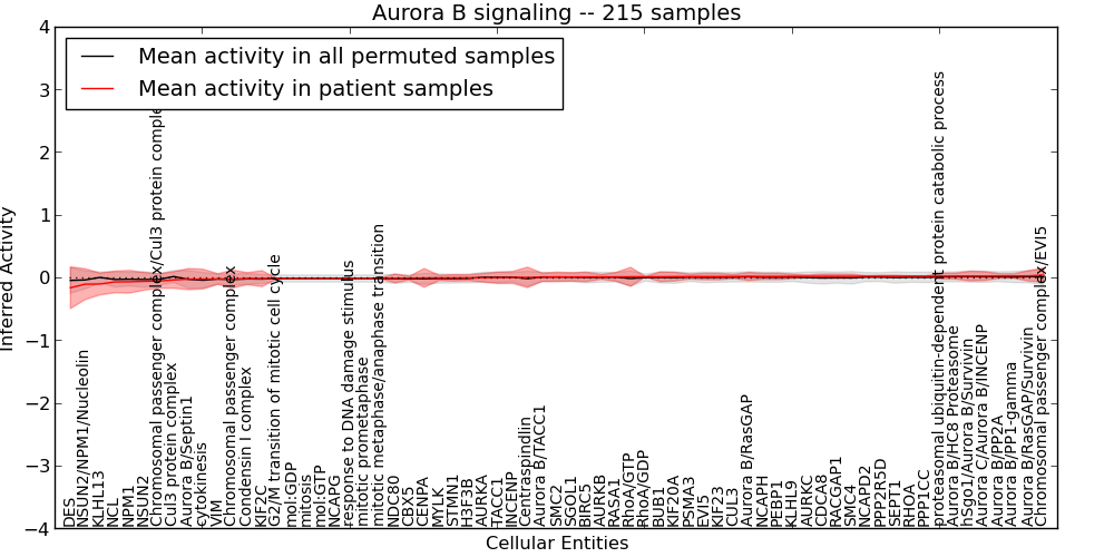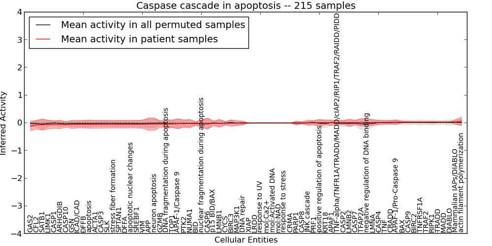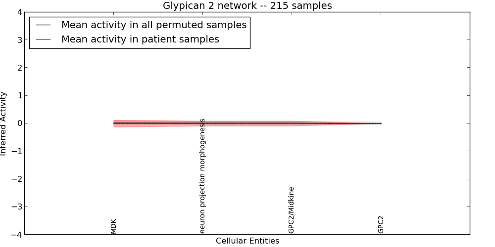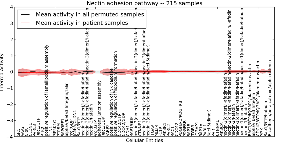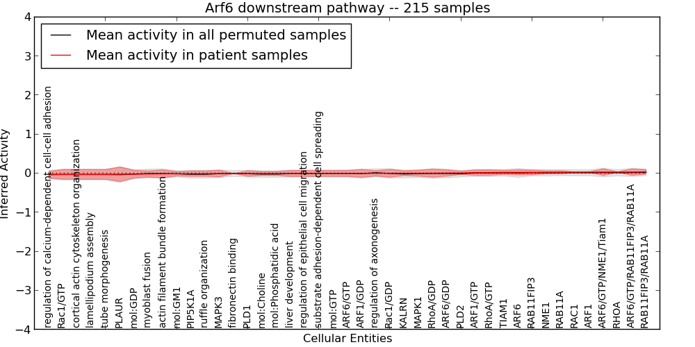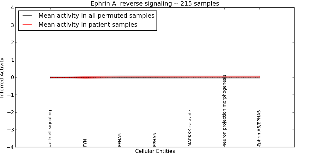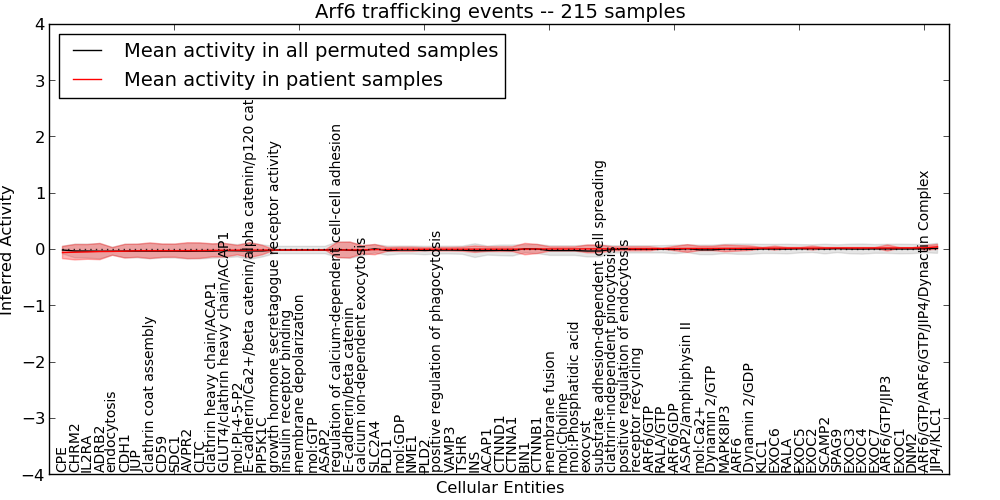 Figure S130. Get High-res Image This plot shows pathway concept perturbations across all samples against a permutation model. The concepts along the x-axis are sorted by lowest to highest mean activity for the real patient samples. Mean inferred activities are plotted along the y-axis as a colored band showing the average level and one standard deviation range. Real samples are shown in red and permuted samples in black.