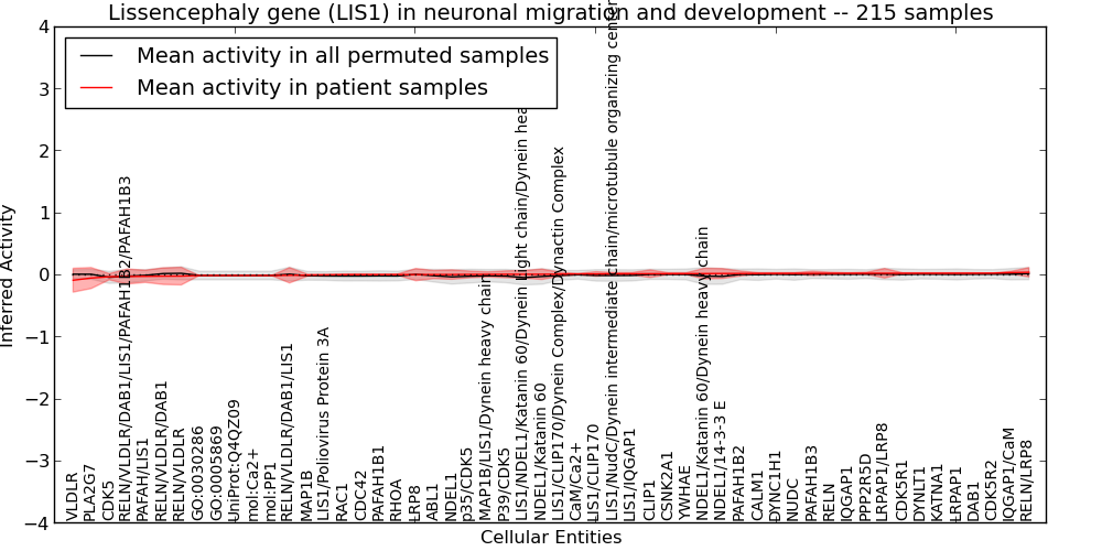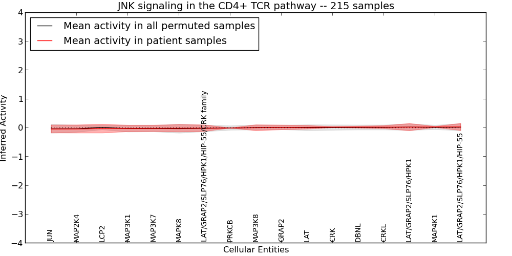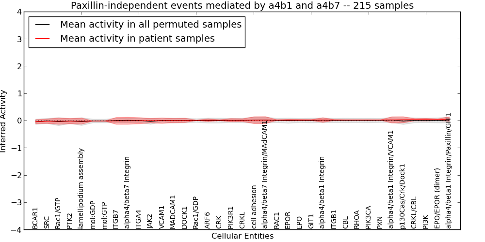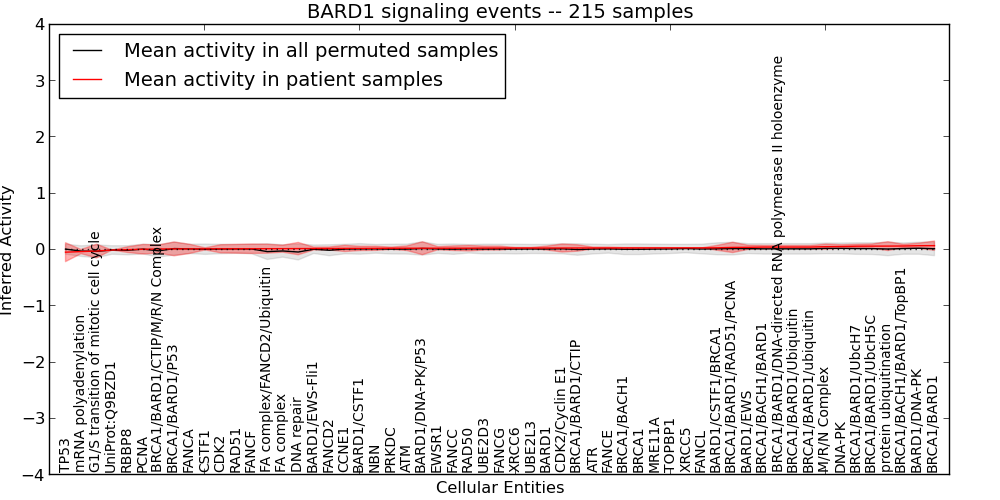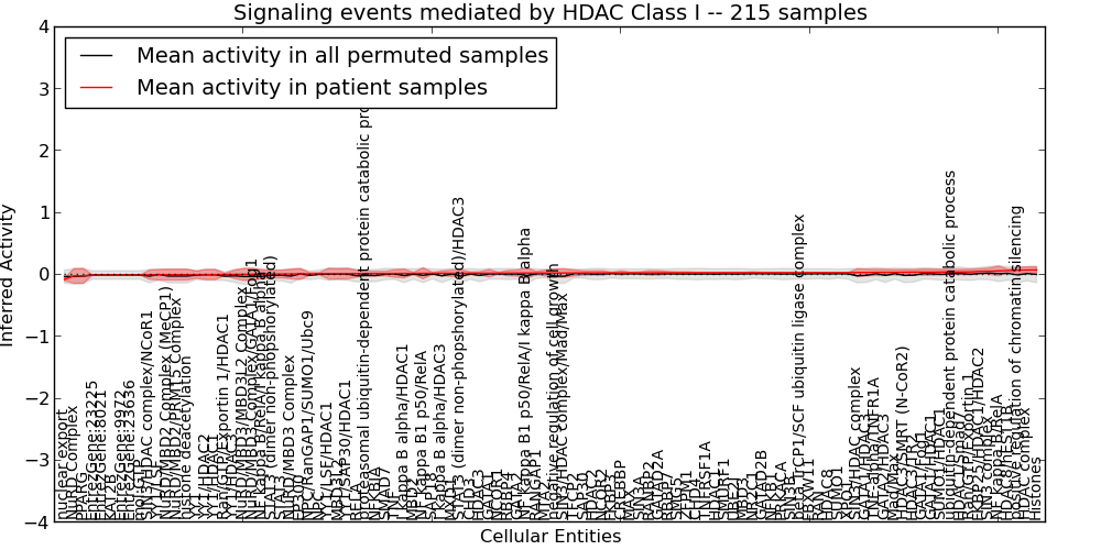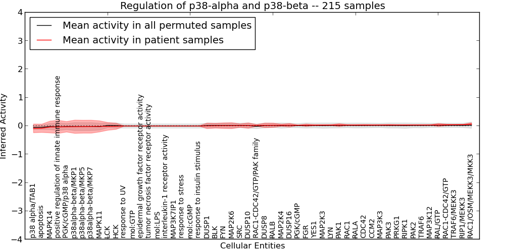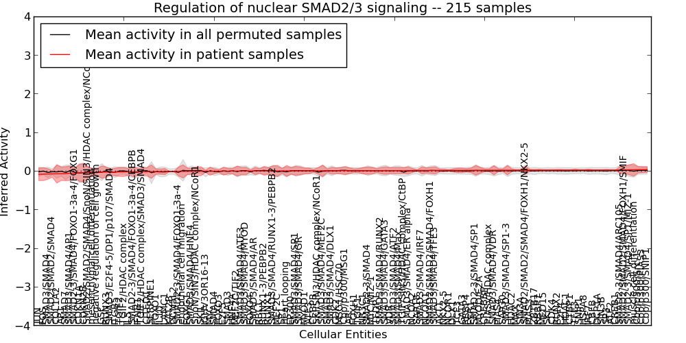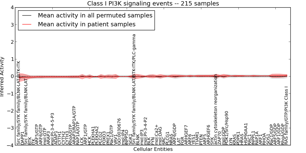 Figure S130. Get High-res Image This plot shows pathway concept perturbations across all samples against a permutation model. The concepts along the x-axis are sorted by lowest to highest mean activity for the real patient samples. Mean inferred activities are plotted along the y-axis as a colored band showing the average level and one standard deviation range. Real samples are shown in red and permuted samples in black.