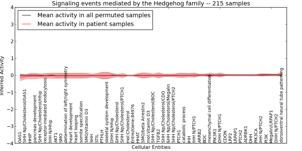 Figure S131. Get High-res Image This plot shows pathway concept perturbations across all samples against a permutation model. The concepts along the x-axis are sorted by lowest to highest mean activity for the real patient samples. Mean inferred activities are plotted along the y-axis as a colored band showing the average level and one standard deviation range. Real samples are shown in red and permuted samples in black.