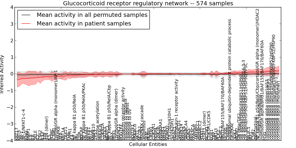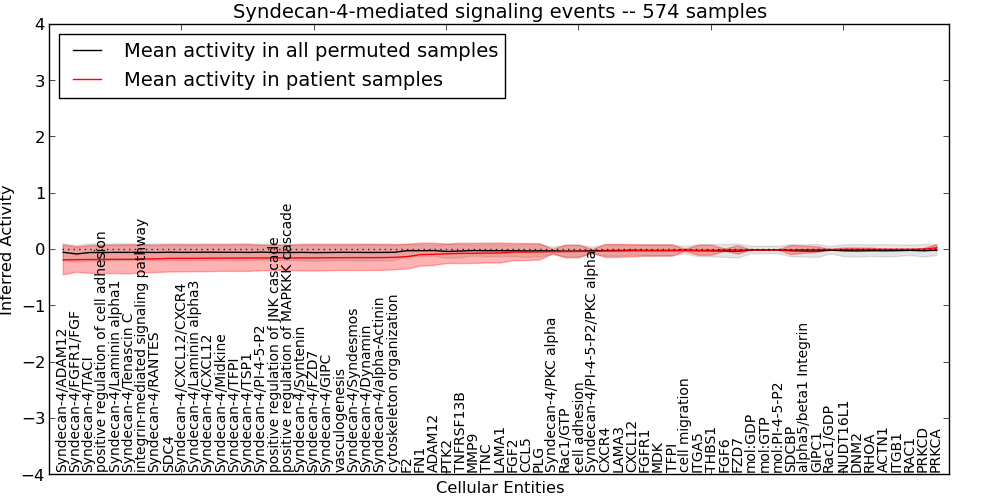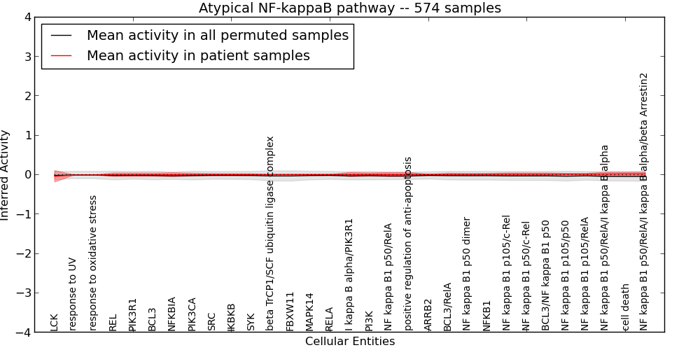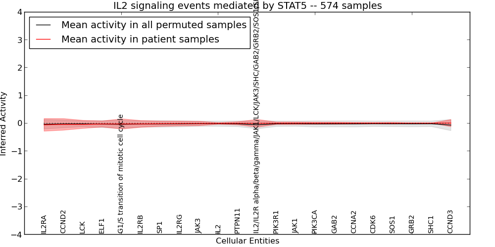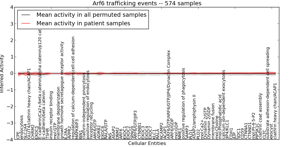 Figure S131.  Get High-res Image This plot shows pathway concept perturbations across all samples against a permutation model. The concepts along the x-axis are sorted by lowest to highest mean activity for the real patient samples. Mean inferred activities are plotted along the y-axis as a colored band showing the average level and one standard deviation range. Real samples are shown in red and permuted samples in black.