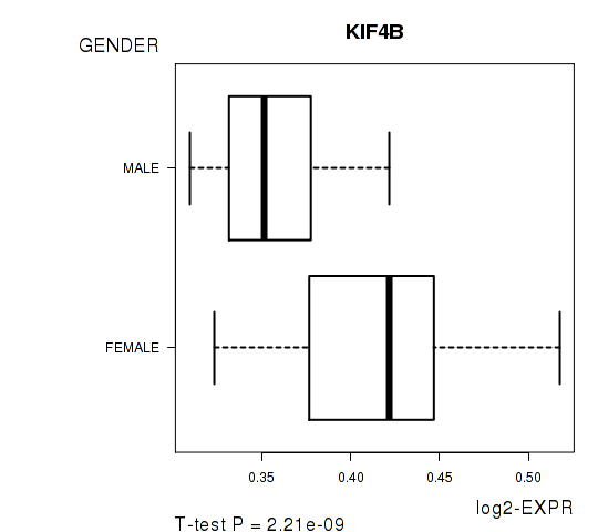 Figure S1. Get High-res Image As an example, this figure shows the association of KIF4B to 'GENDER'. P value = 2.21e-09 with T-test analysis.