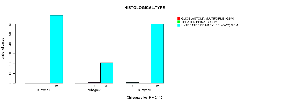 Table S62. Clustering Approach #9: 'RNAseq CNMF subtypes' versus Clinical Feature #5: 'HISTOLOGICAL.TYPE'