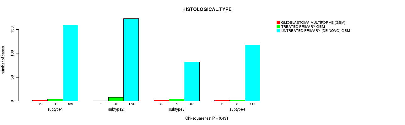 CNMF clustering analysis on array-based mRNA expression data identified 4 subtypes that correlate to 'HISTOLOGICAL.TYPE'.