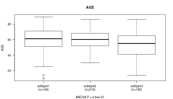 Table S59. Clustering Approach #9: 'RNAseq CNMF subtypes' versus Clinical Feature #2: 'AGE'