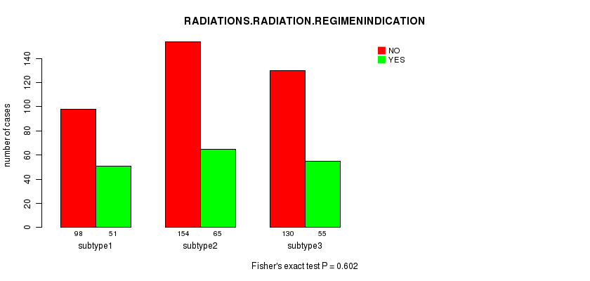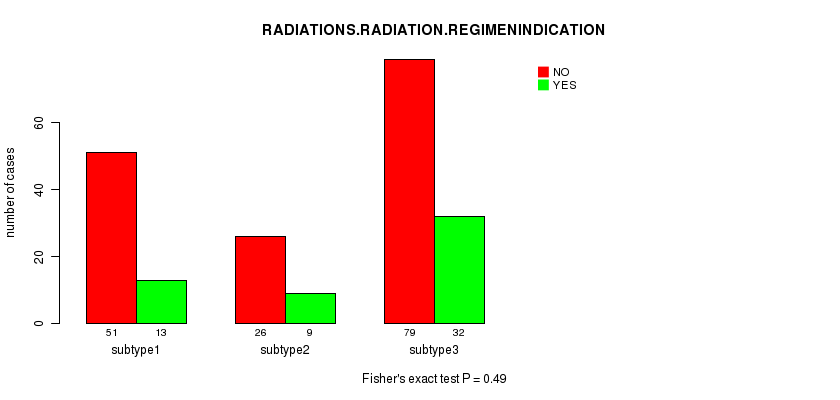 Figure S60. Get High-res Image Clustering Approach #10: 'RNAseq cHierClus subtypes' versus Clinical Feature #6: 'RADIATIONS.RADIATION.REGIMENINDICATION'