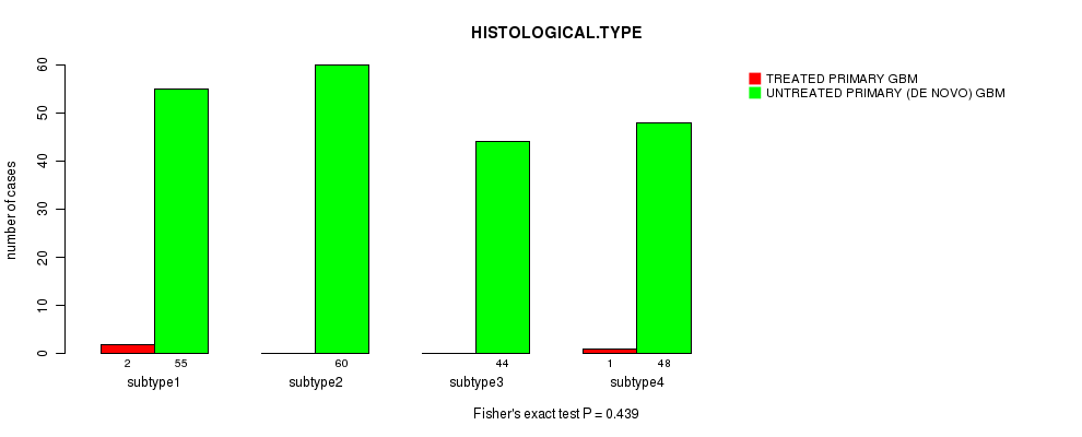 Table S69. Clustering Approach #10: 'RNAseq cHierClus subtypes' versus Clinical Feature #5: 'HISTOLOGICAL.TYPE'