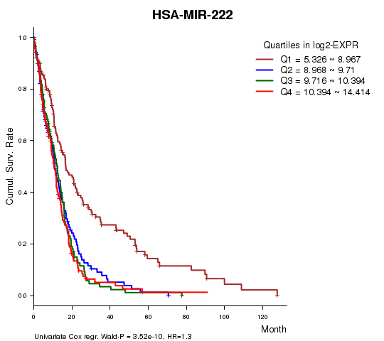 Figure S1. Get High-res Image As an example, this figure shows the association of HSA-MIR-222 to 'Time to Death'. four curves present the cumulative survival rates of 4 quartile subsets of patients. P value = 3.52e-10 with univariate Cox regression analysis using continuous log-2 expression values.