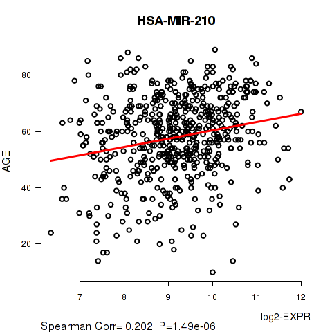 Figure S2. Get High-res Image As an example, this figure shows the association of HSA-MIR-210 to 'AGE'. P value = 1.49e-06 with Spearman correlation analysis. The straight line presents the best linear regression.