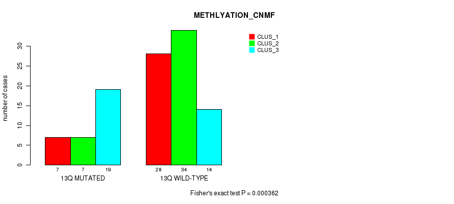 13q cnv correlated to 'MRNA_CNMF', 'MRNA_CHIERARCHICAL', 'CN_CNMF', and 'METHLYATION_CNMF'.