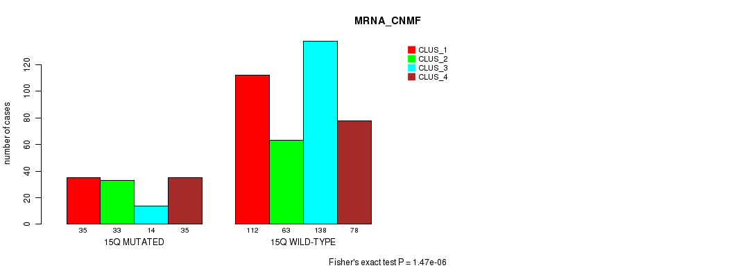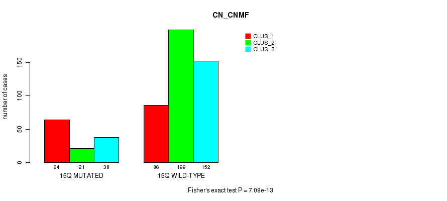 15q cnv correlated to 'MRNA_CNMF', 'MRNA_CHIERARCHICAL', 'CN_CNMF', and 'METHLYATION_CNMF'.