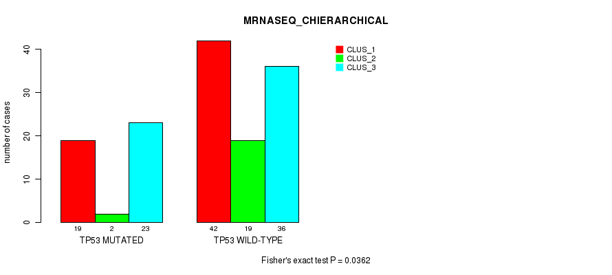 TP53 mutation correlated to 'MRNA_CNMF', 'MRNA_CHIERARCHICAL', 'MIR_CNMF', 'MIR_CHIERARCHICAL', 'CN_CNMF', 'METHLYATION_CNMF', and 'MRNASEQ_CNMF'.