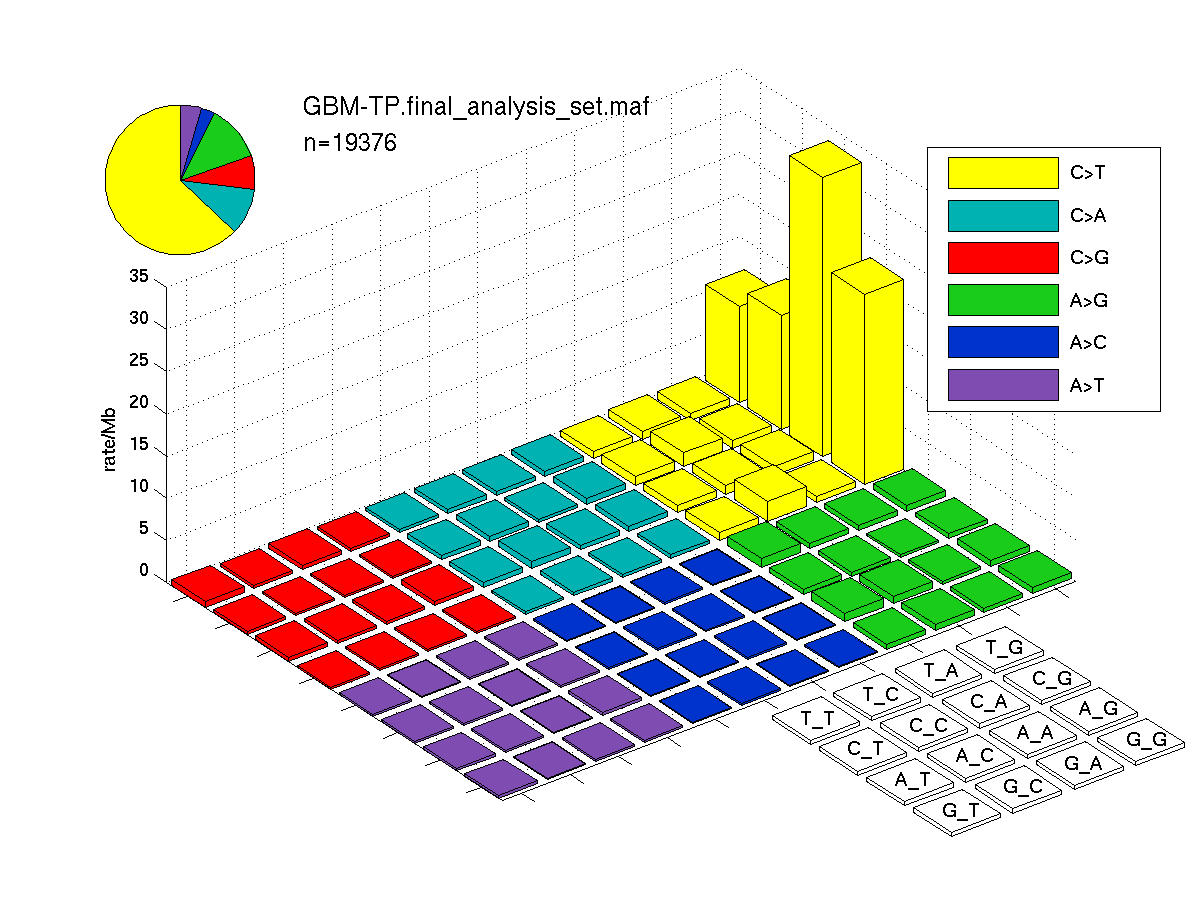 Figure 3. Get High-res Image SNV Mutation rate lego plot for entire set. Each bin is normalized by base coverage for that bin. Colors represent the six SNV types on the upper right. The three-base context for each mutation is labeled in the 4x4 legend on the lower right. The fractional breakdown of SNV counts is shown in the pie chart on the upper left. If this figure is blank, not enough information was provided in the MAF to generate it.