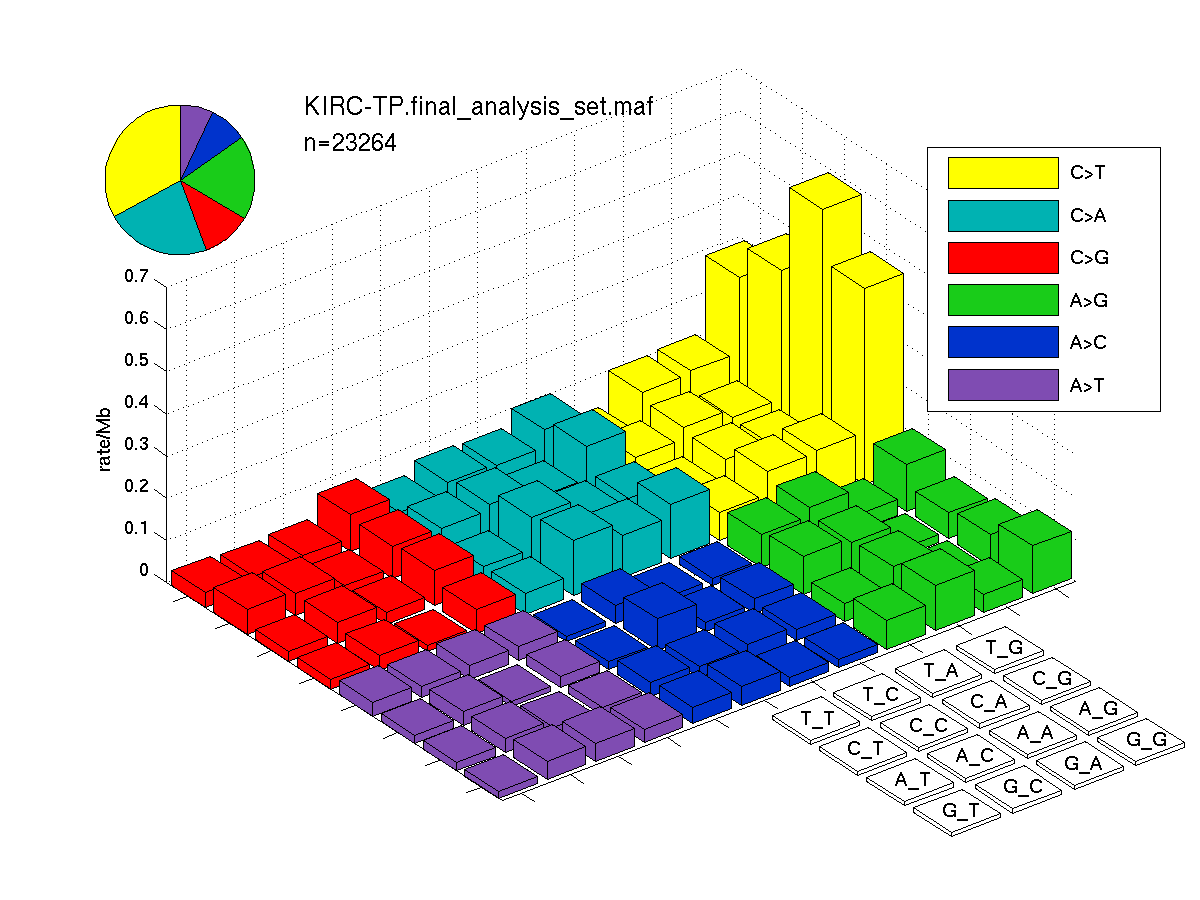 Figure 3. Get High-res Image SNV Mutation rate lego plot for entire set. Each bin is normalized by base coverage for that bin. Colors represent the six SNV types on the upper right. The three-base context for each mutation is labeled in the 4x4 legend on the lower right. The fractional breakdown of SNV counts is shown in the pie chart on the upper left. If this figure is blank, not enough information was provided in the MAF to generate it.