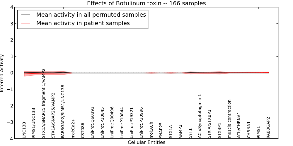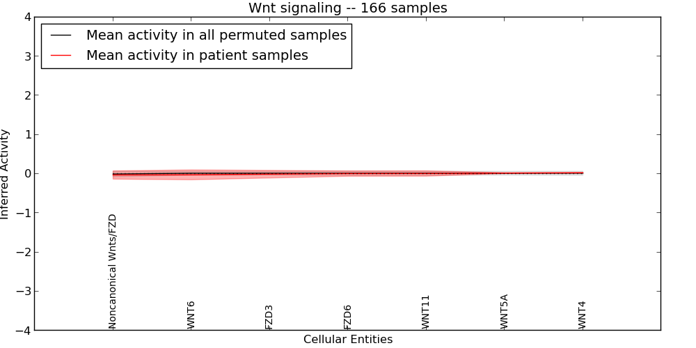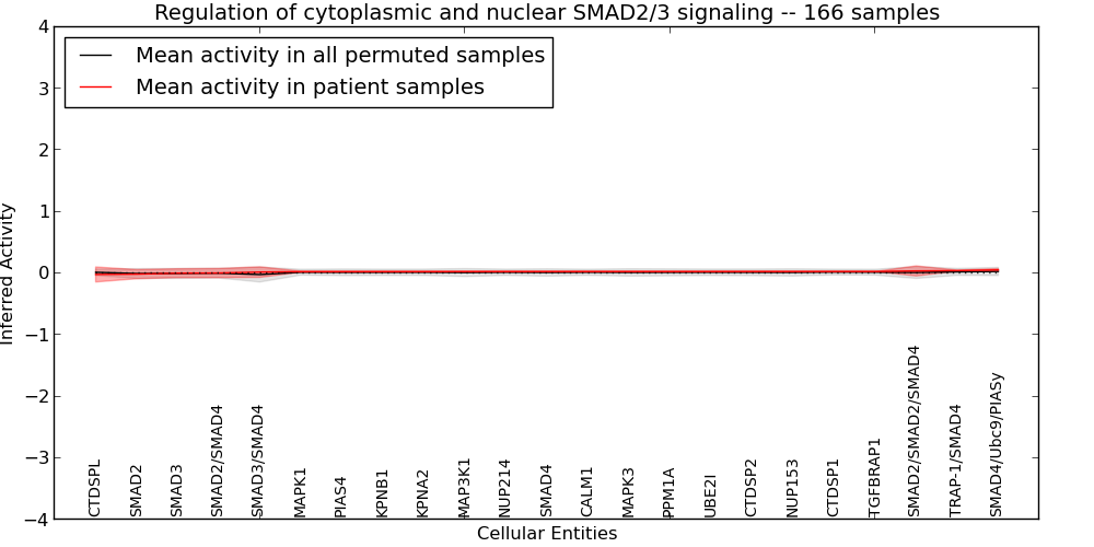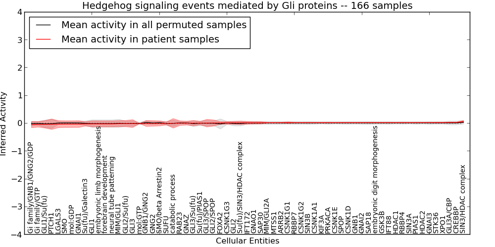 Figure S131. Get High-res Image This plot shows pathway concept perturbations across all samples against a permutation model. The concepts along the x-axis are sorted by lowest to highest mean activity for the real patient samples. Mean inferred activities are plotted along the y-axis as a colored band showing the average level and one standard deviation range. Real samples are shown in red and permuted samples in black.