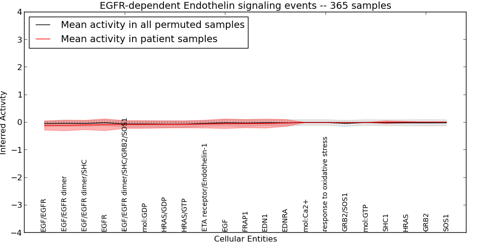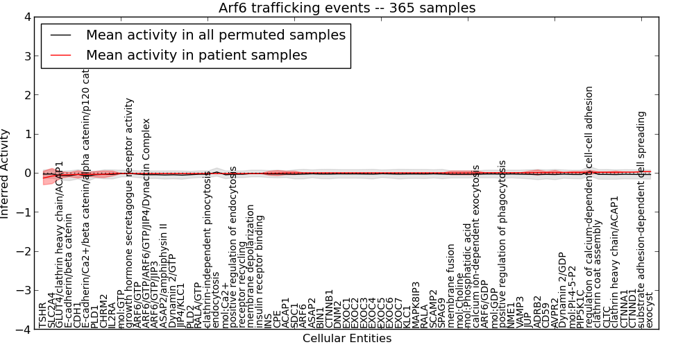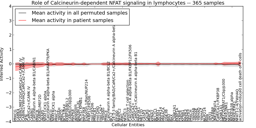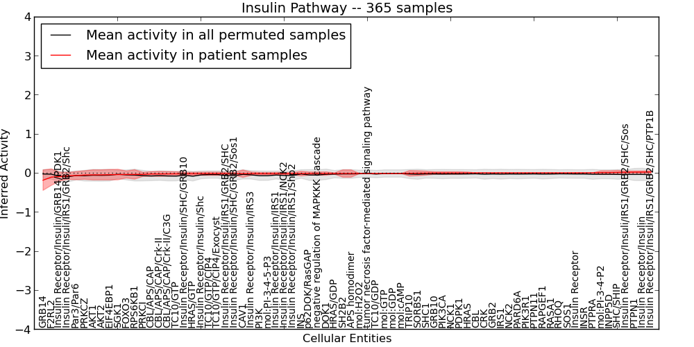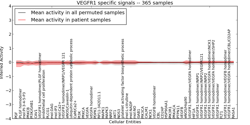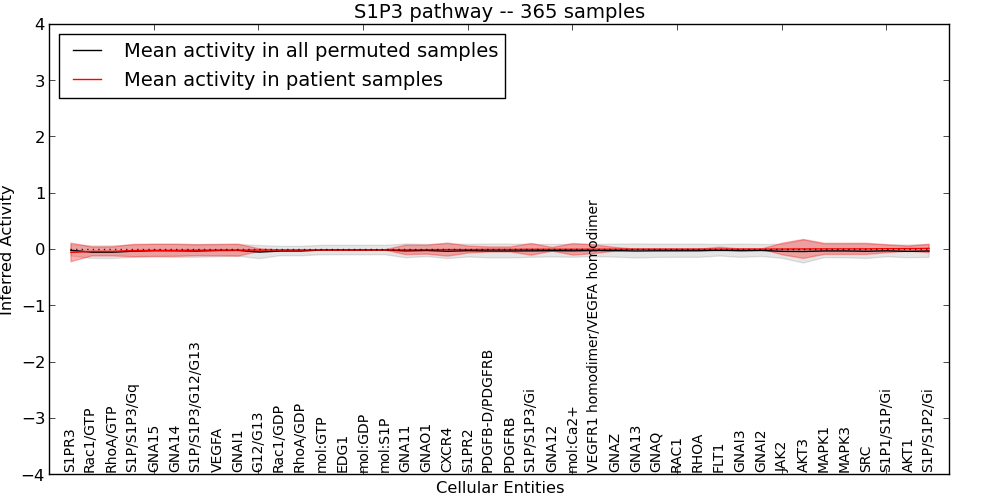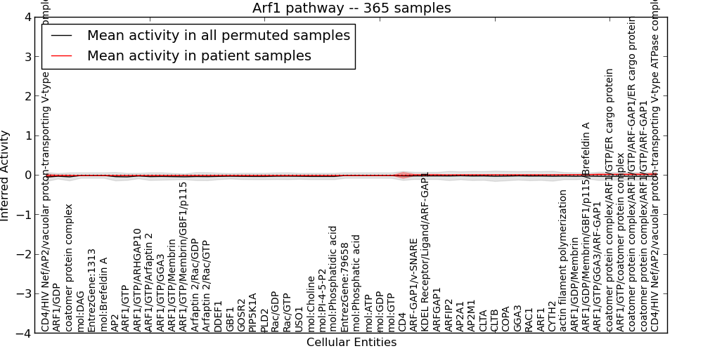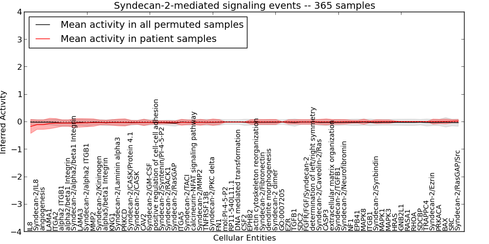 Figure S131. Get High-res Image This plot shows pathway concept perturbations across all samples against a permutation model. The concepts along the x-axis are sorted by lowest to highest mean activity for the real patient samples. Mean inferred activities are plotted along the y-axis as a colored band showing the average level and one standard deviation range. Real samples are shown in red and permuted samples in black.
