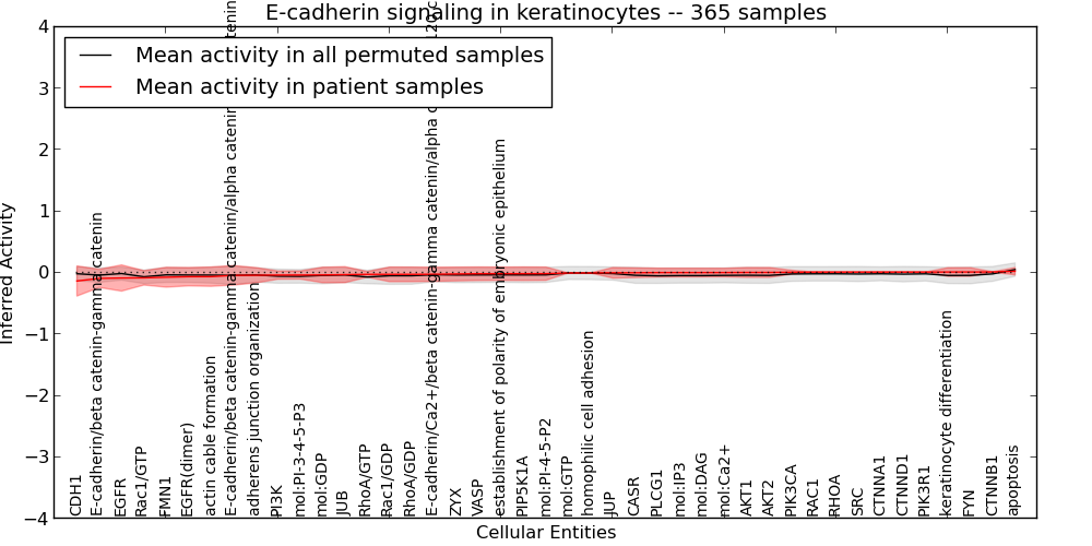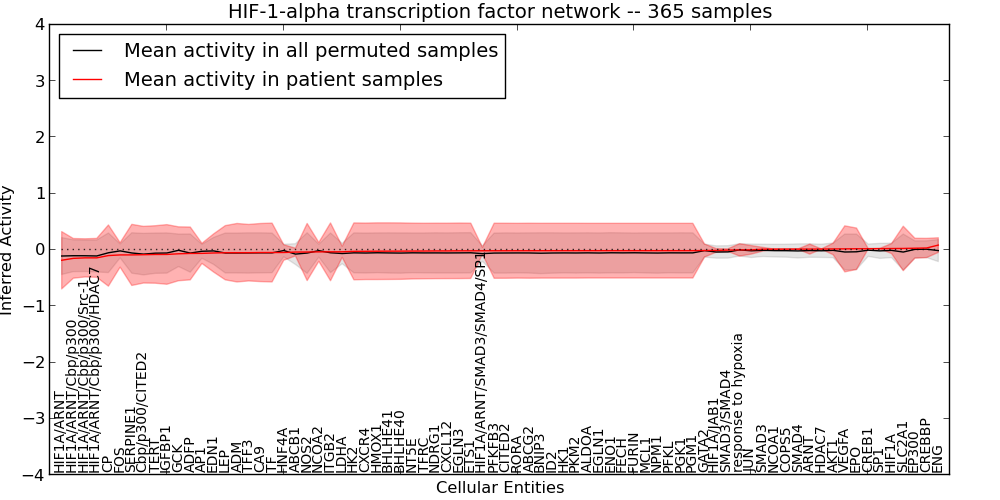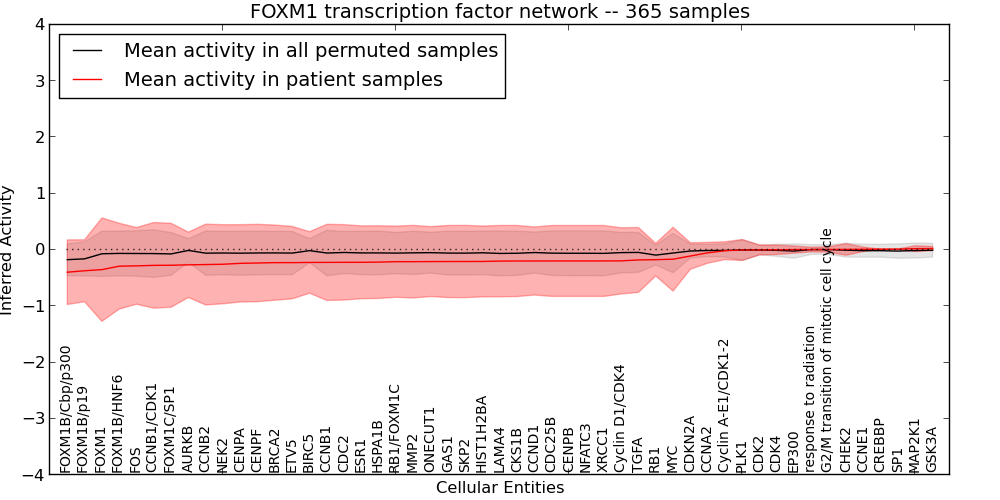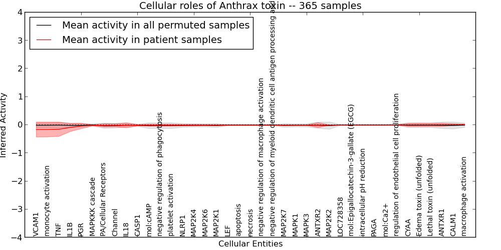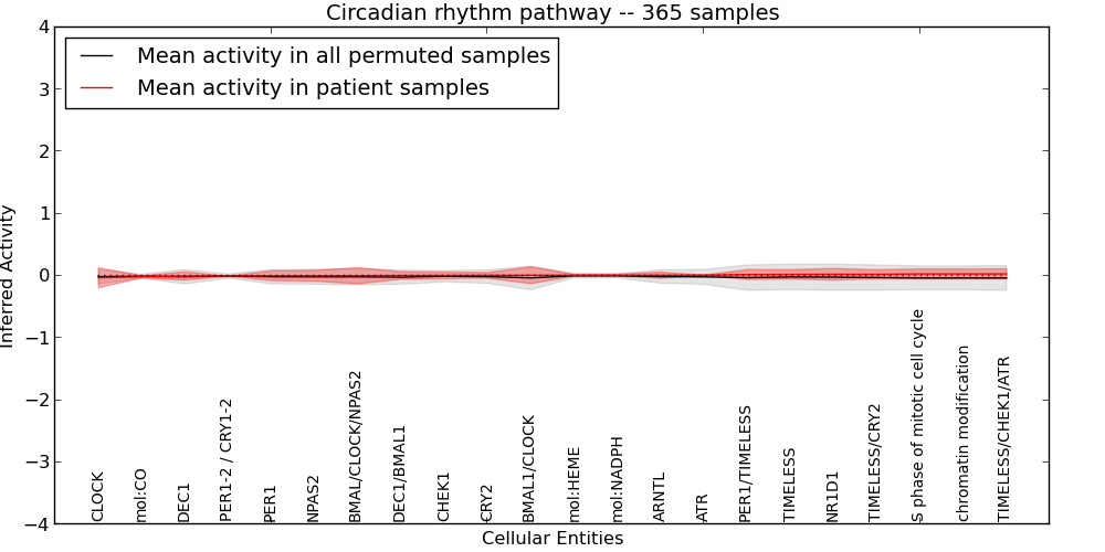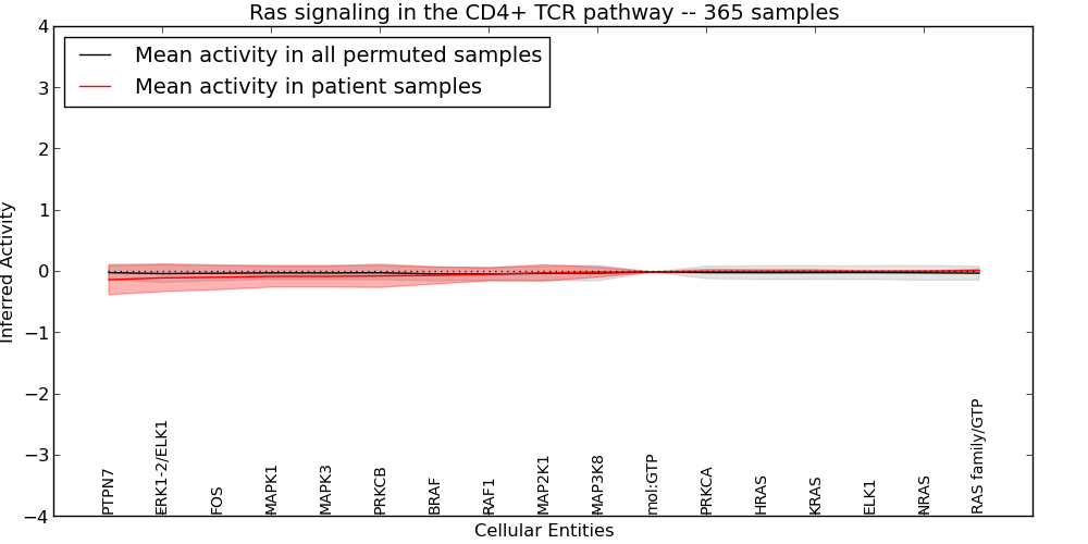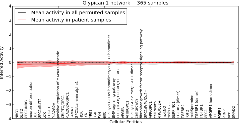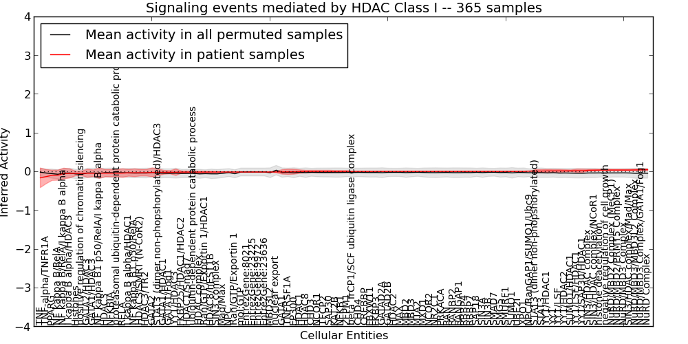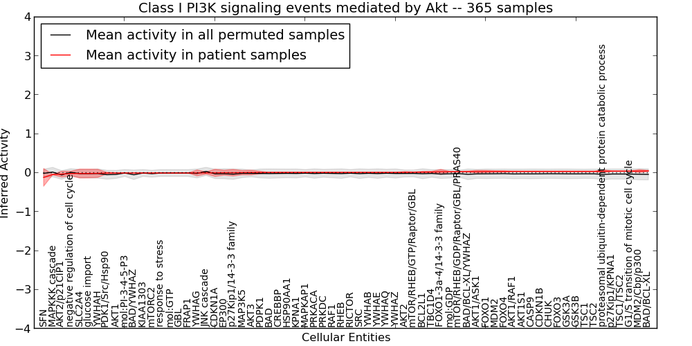 Figure S131. Get High-res Image This plot shows pathway concept perturbations across all samples against a permutation model. The concepts along the x-axis are sorted by lowest to highest mean activity for the real patient samples. Mean inferred activities are plotted along the y-axis as a colored band showing the average level and one standard deviation range. Real samples are shown in red and permuted samples in black.