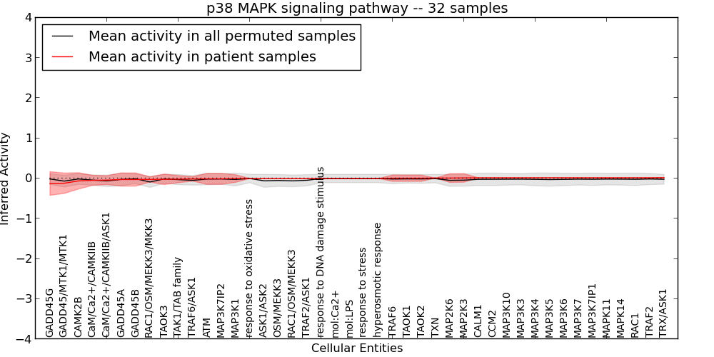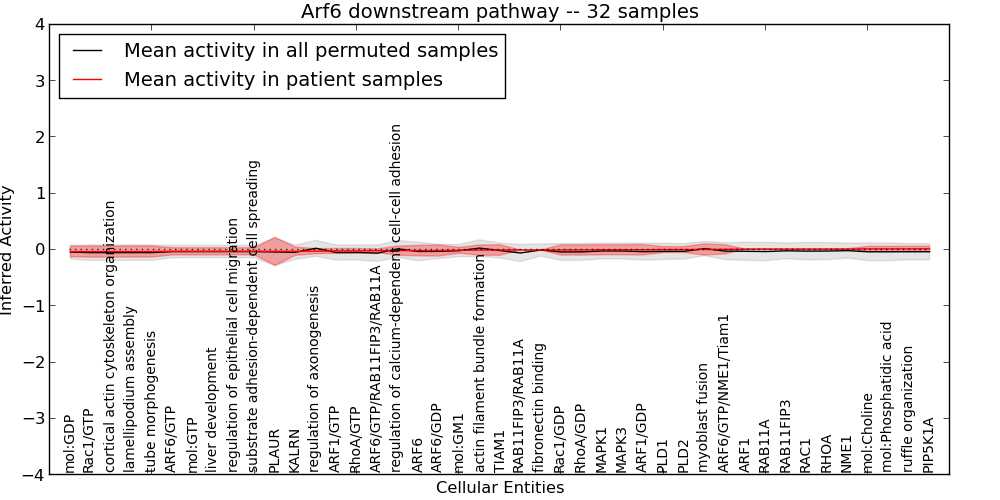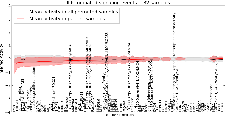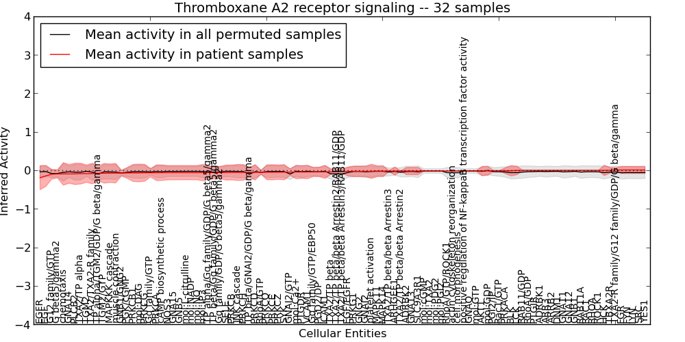 Figure S131. Get High-res Image This plot shows pathway concept perturbations across all samples against a permutation model. The concepts along the x-axis are sorted by lowest to highest mean activity for the real patient samples. Mean inferred activities are plotted along the y-axis as a colored band showing the average level and one standard deviation range. Real samples are shown in red and permuted samples in black.
