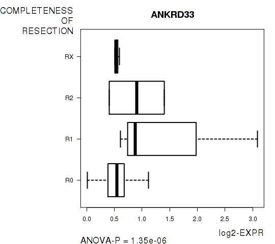 Figure S4. Get High-res Image As an example, this figure shows the association of ANKRD33 to 'COMPLETENESS.OF.RESECTION'. P value = 1.35e-06 with ANOVA analysis.