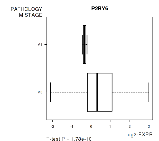 Figure S1. Get High-res Image As an example, this figure shows the association of P2RY6 to 'PATHOLOGY.M.STAGE'. P value = 1.78e-10 with T-test analysis.