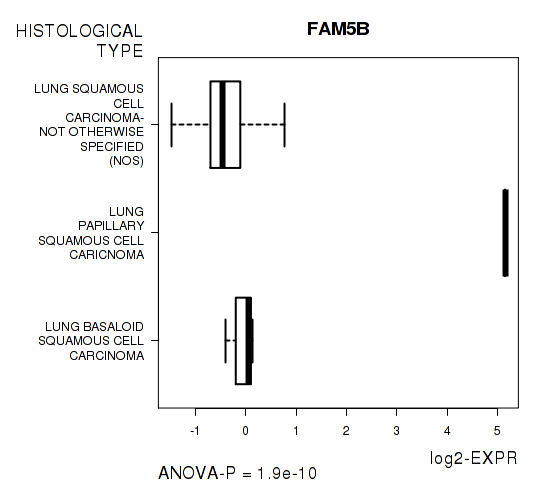 Figure S3. Get High-res Image As an example, this figure shows the association of FAM5B to 'HISTOLOGICAL.TYPE'. P value = 1.9e-10 with ANOVA analysis.