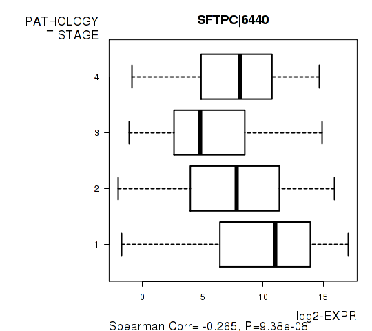 Figure S3. Get High-res Image As an example, this figure shows the association of SFTPC|6440 to 'PATHOLOGY.T.STAGE'. P value = 9.38e-08 with Spearman correlation analysis.