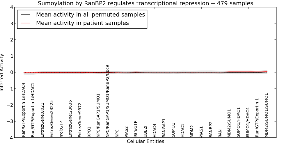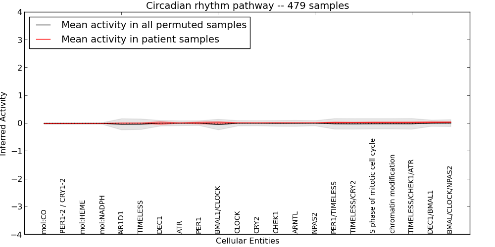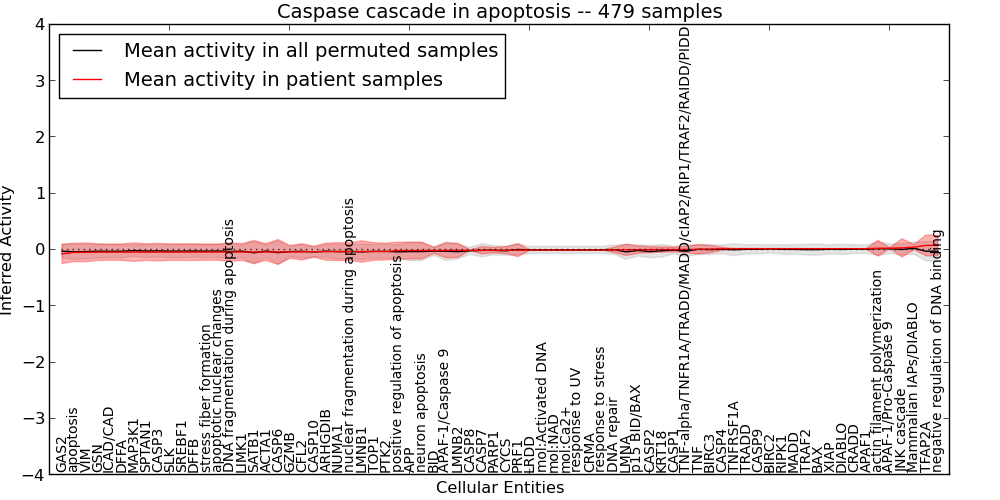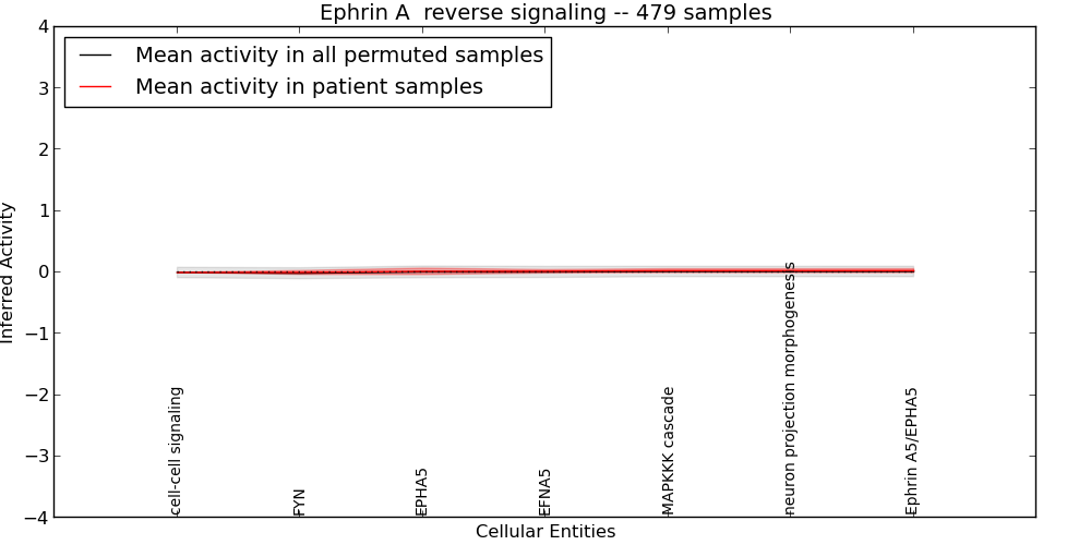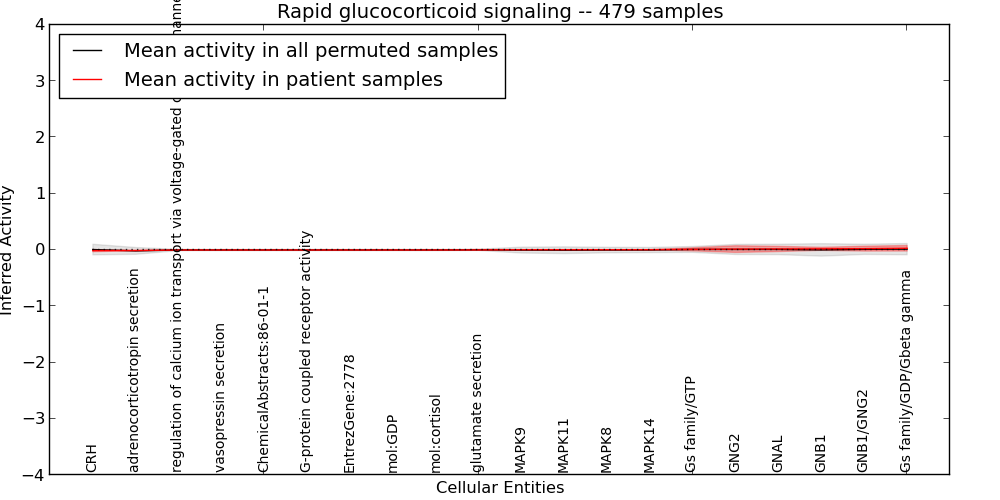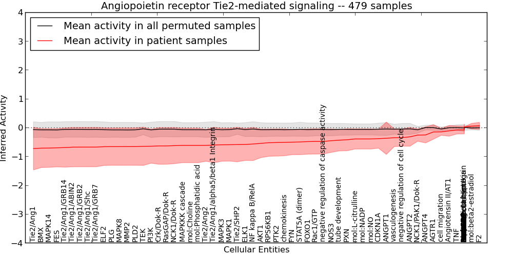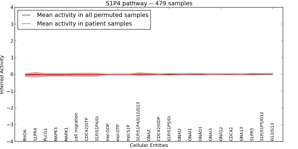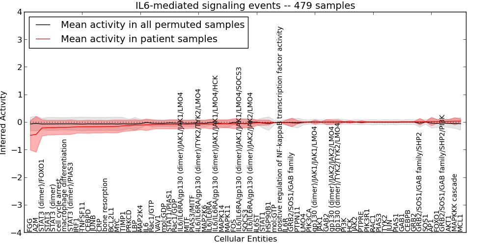 Figure S128. Get High-res Image This plot shows pathway concept perturbations across all samples against a permutation model. The concepts along the x-axis are sorted by lowest to highest mean activity for the real patient samples. Mean inferred activities are plotted along the y-axis as a colored band showing the average level and one standard deviation range. Real samples are shown in red and permuted samples in black.