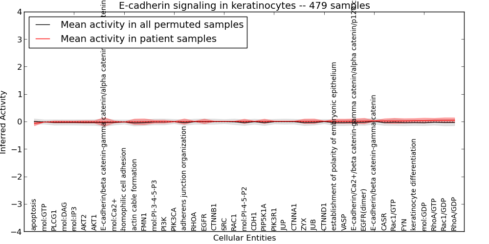 The significance of the IPL obtained for each concept in each patient sample is assessed using a permutation analysis. Importantly, the permutation analysis preserves data tuples so as to preserve any implicit correlations between the different data modalities. For example, genes that are deleted have concomitantly lower expression levels. Preserving the copy number and expression pairs therefore retains this data property. The simulation therefore makes "null samples" by permuting data tuples across all of the genes in the genome so that each gene in a null sample is associated with a random tuple of another gene with equal probability. This approach has the added benefit of preserving the pathway structure so that every observed IPL can be compared to a distribution of random IPLs derived from exactly the same interaction context. PARADIGM inferences are then obtained for 1000 "null" patients and serve as a background distribution to contrast the observed IPLs against. Pathway concepts are excluded from further analysis if they did not obtain a minimum IPL of 0.5 in any patient sample both observed or simulated.