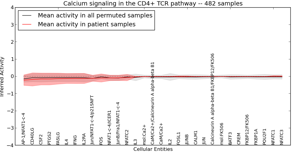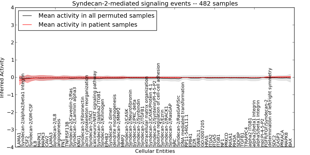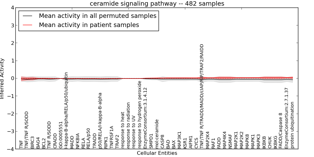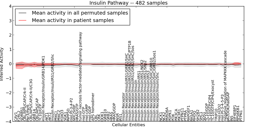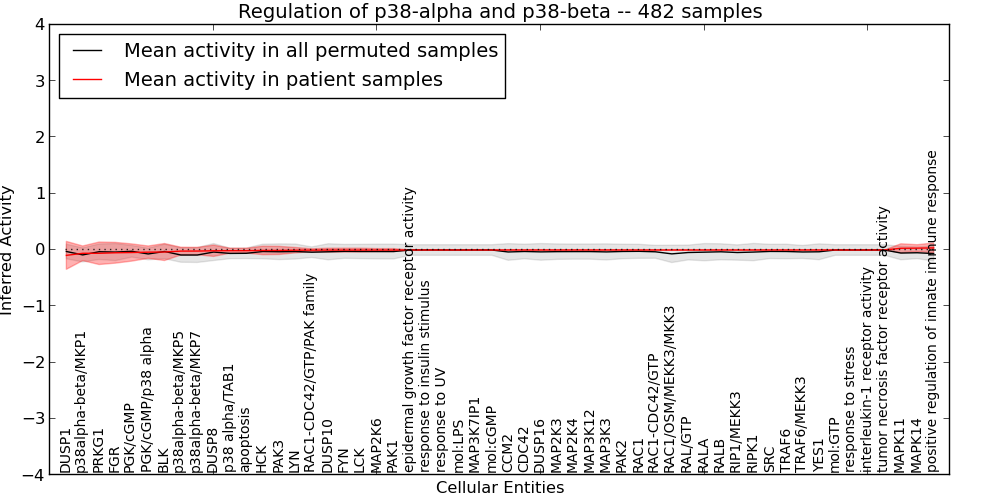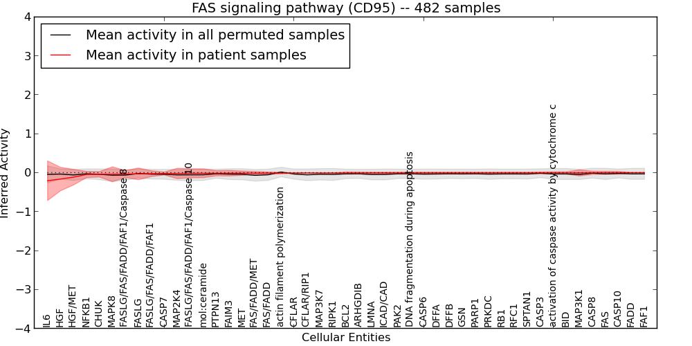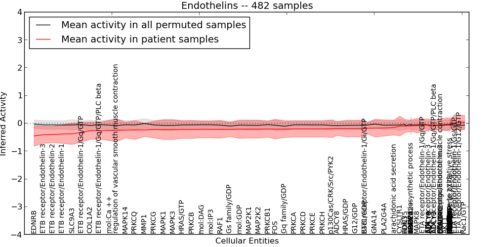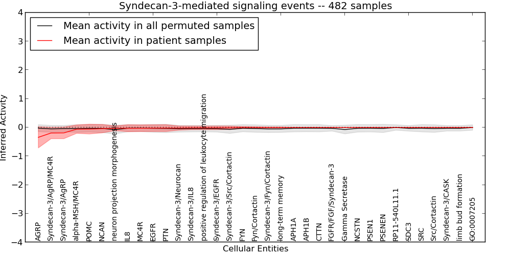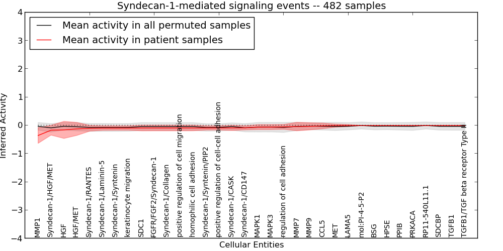 Figure S131.  Get High-res Image This plot shows pathway concept perturbations across all samples against a permutation model. The concepts along the x-axis are sorted by lowest to highest mean activity for the real patient samples. Mean inferred activities are plotted along the y-axis as a colored band showing the average level and one standard deviation range. Real samples are shown in red and permuted samples in black.