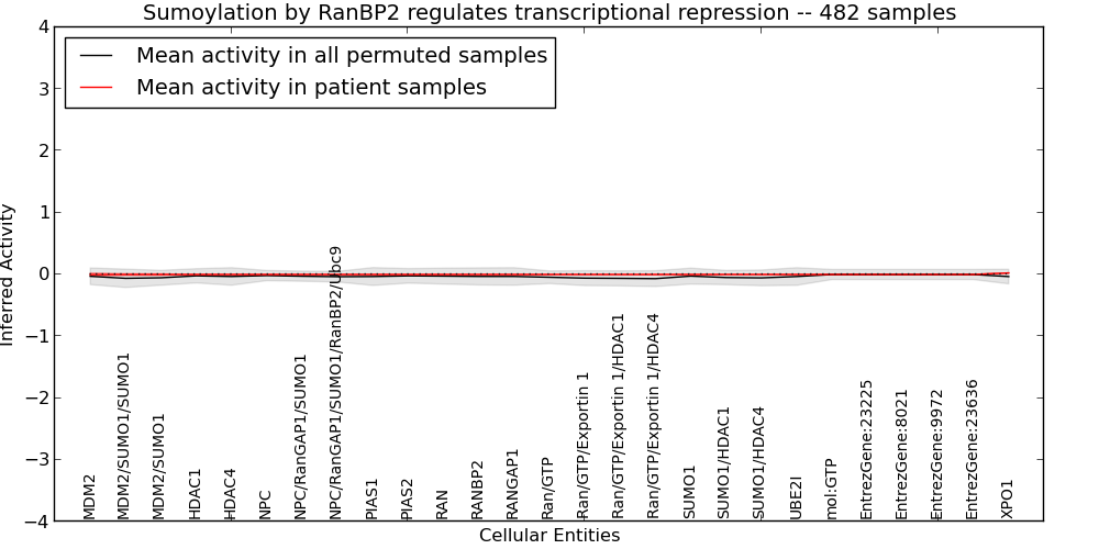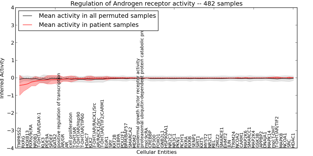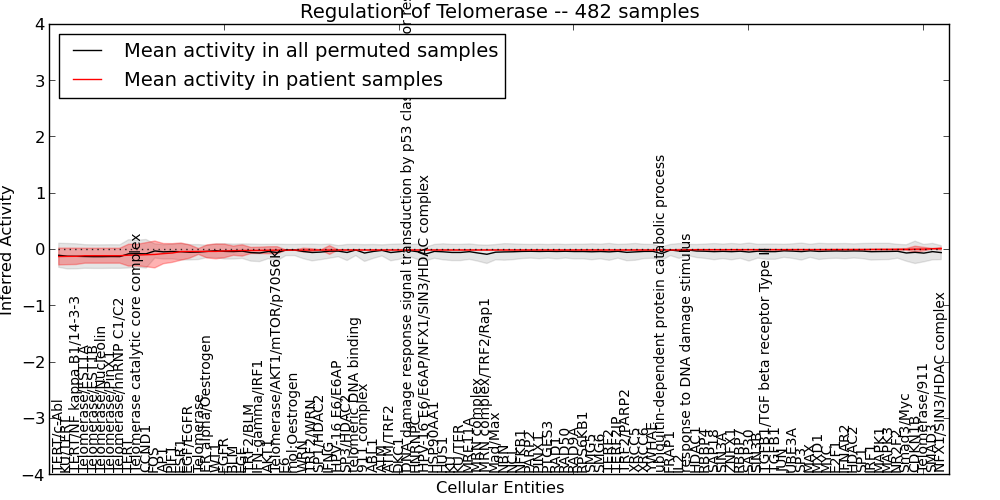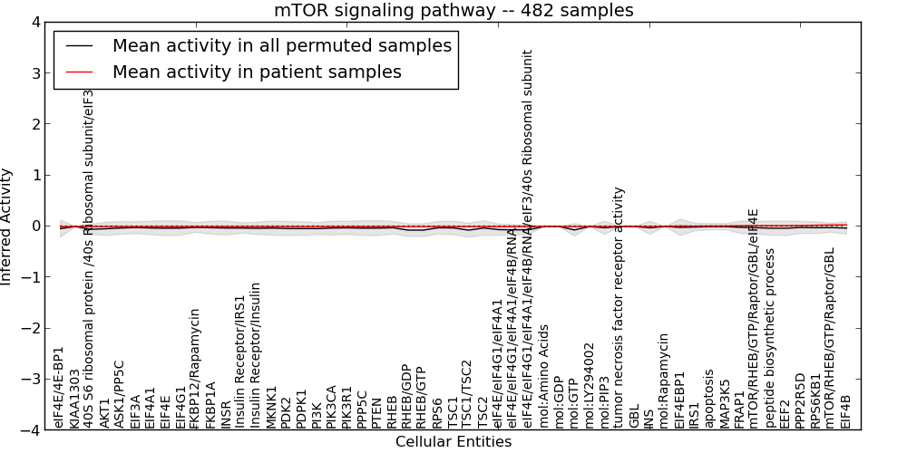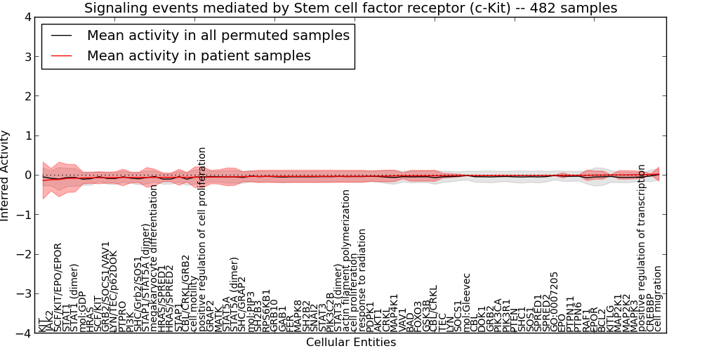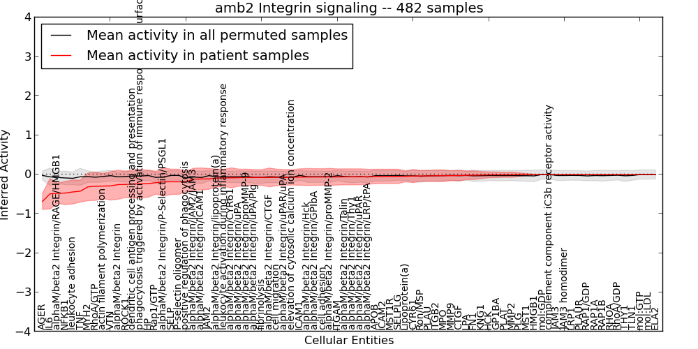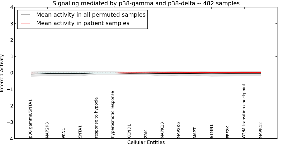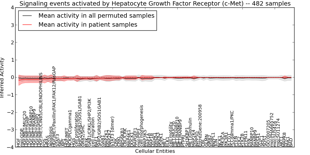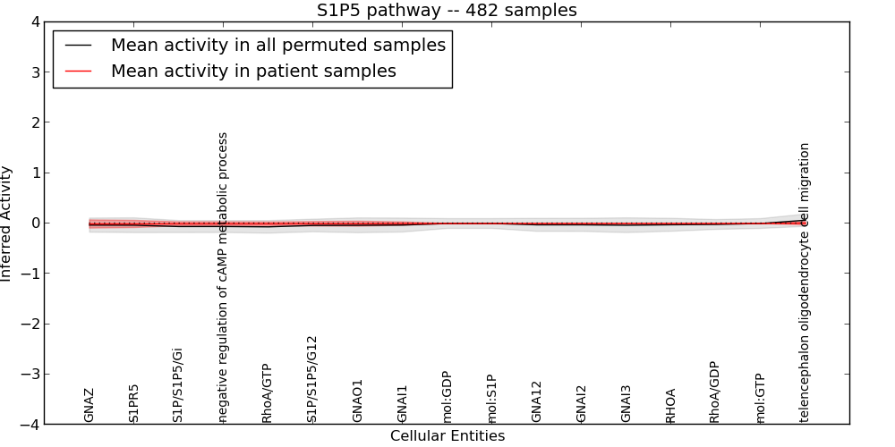 Figure S131.  Get High-res Image This plot shows pathway concept perturbations across all samples against a permutation model. The concepts along the x-axis are sorted by lowest to highest mean activity for the real patient samples. Mean inferred activities are plotted along the y-axis as a colored band showing the average level and one standard deviation range. Real samples are shown in red and permuted samples in black.