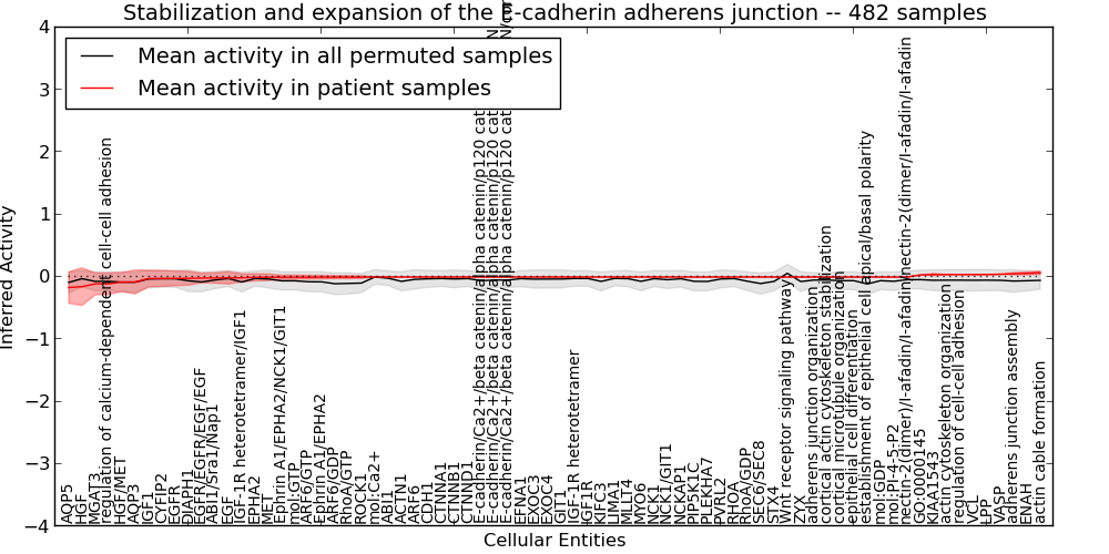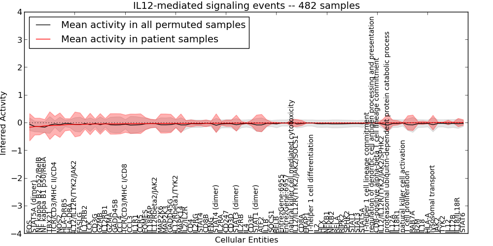 Figure S130.  Get High-res Image This plot shows pathway concept perturbations across all samples against a permutation model. The concepts along the x-axis are sorted by lowest to highest mean activity for the real patient samples. Mean inferred activities are plotted along the y-axis as a colored band showing the average level and one standard deviation range. Real samples are shown in red and permuted samples in black.