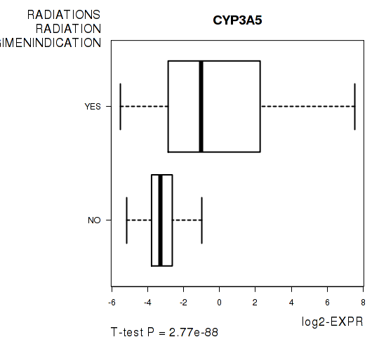Figure S10. Get High-res Image As an example, this figure shows the association of CYP3A5 to 'RADIATIONS.RADIATION.REGIMENINDICATION'. P value = 2.77e-88 with T-test analysis.