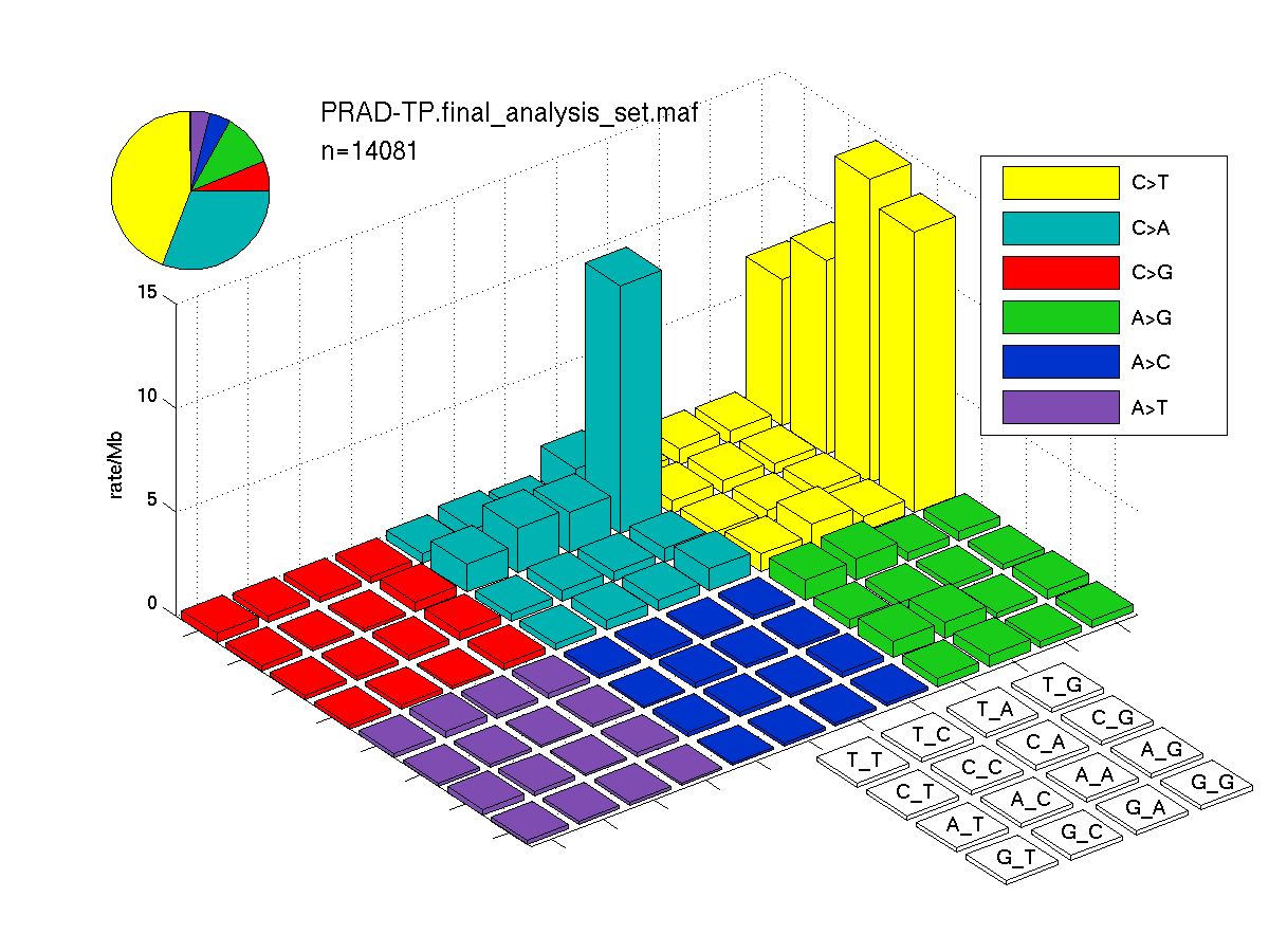 Figure 3. Get High-res Image SNV Mutation rate lego plot for entire set. Each bin is normalized by base coverage for that bin. Colors represent the six SNV types on the upper right. The three-base context for each mutation is labeled in the 4x4 legend on the lower right. The fractional breakdown of SNV counts is shown in the pie chart on the upper left. If this figure is blank, not enough information was provided in the MAF to generate it.