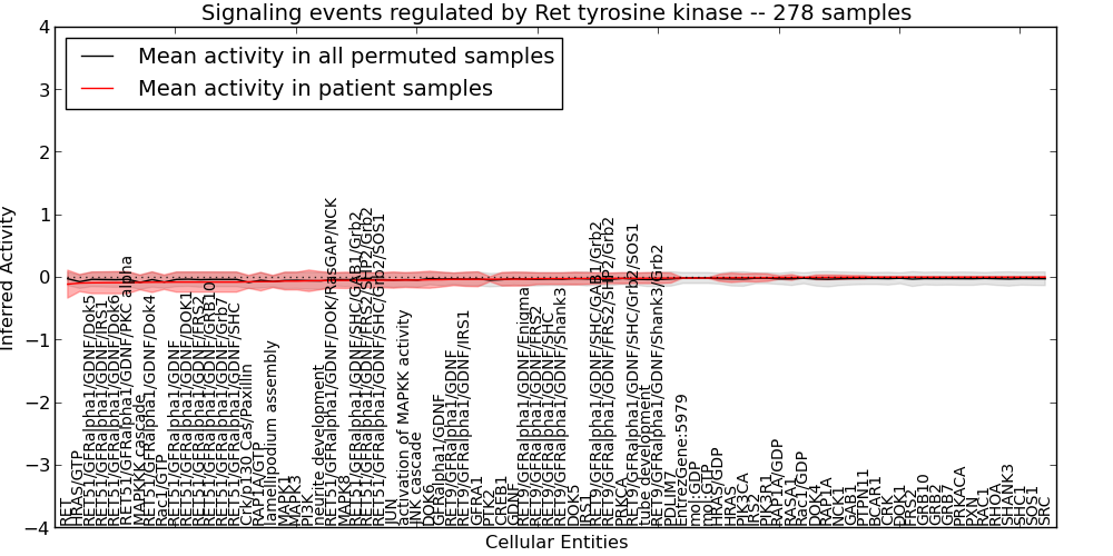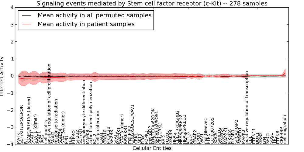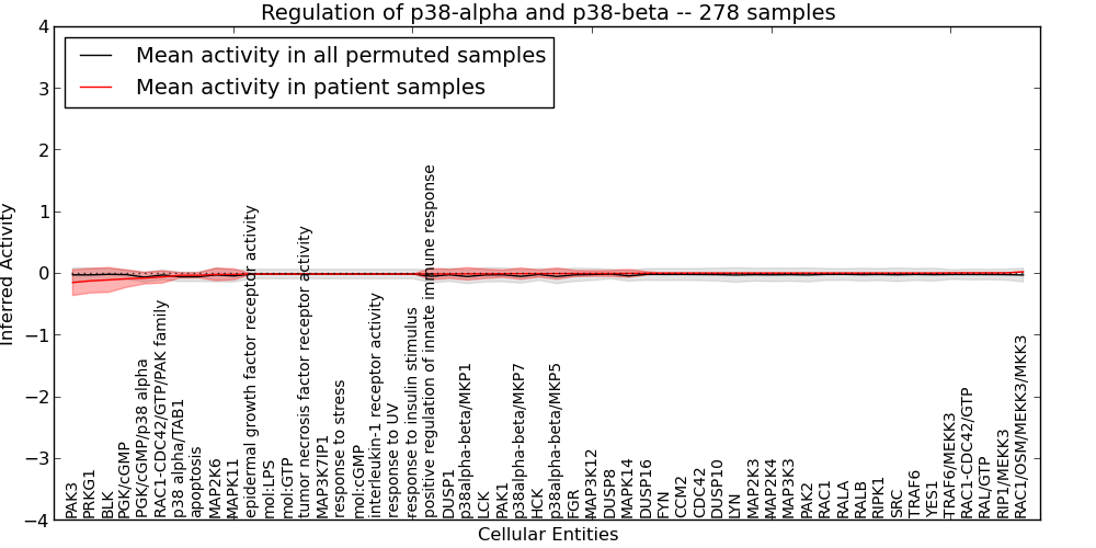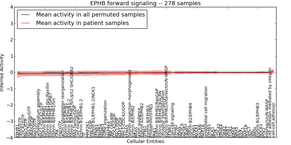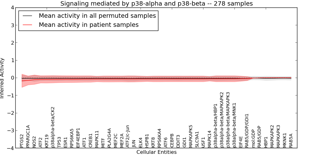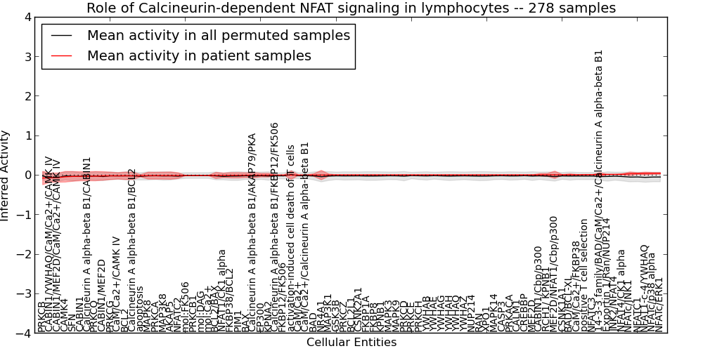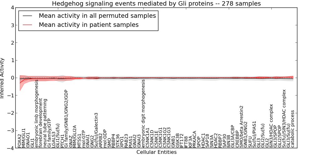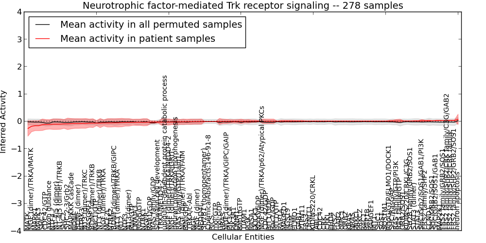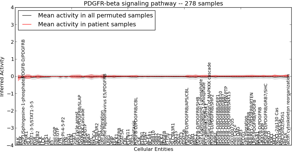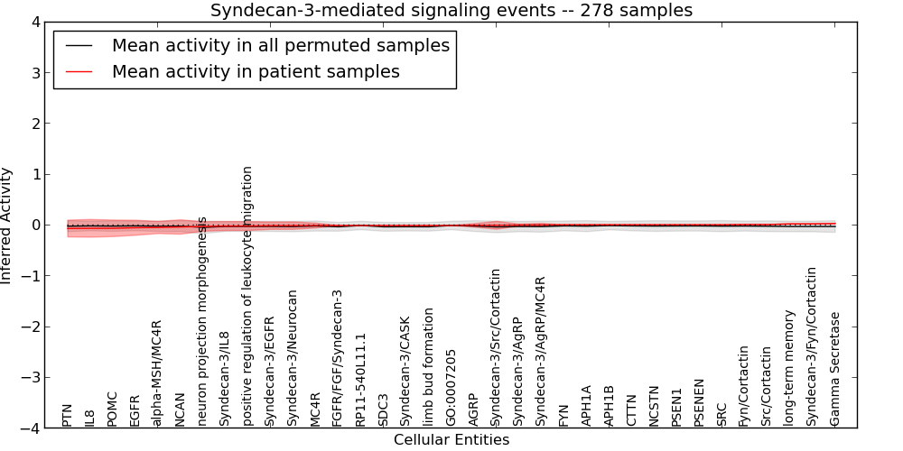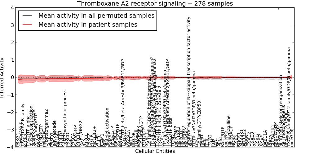 Figure S131.  Get High-res Image This plot shows pathway concept perturbations across all samples against a permutation model. The concepts along the x-axis are sorted by lowest to highest mean activity for the real patient samples. Mean inferred activities are plotted along the y-axis as a colored band showing the average level and one standard deviation range. Real samples are shown in red and permuted samples in black.