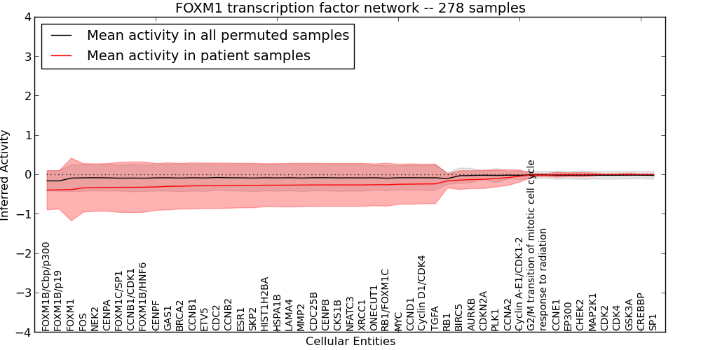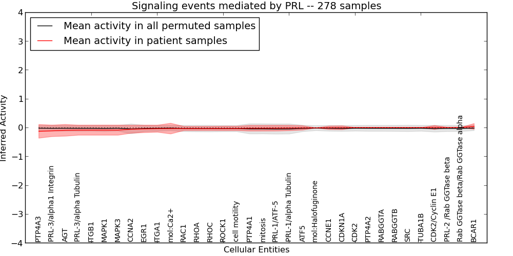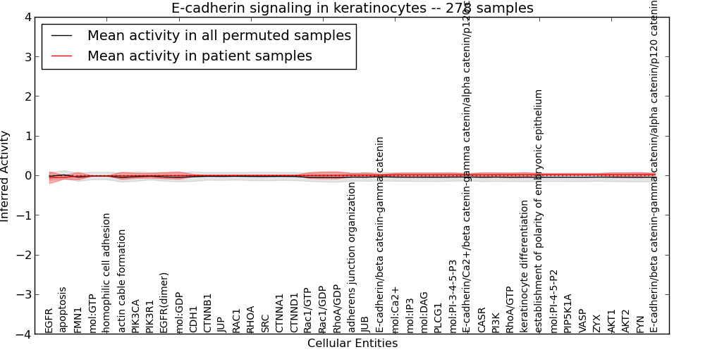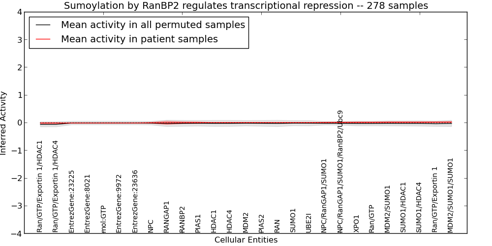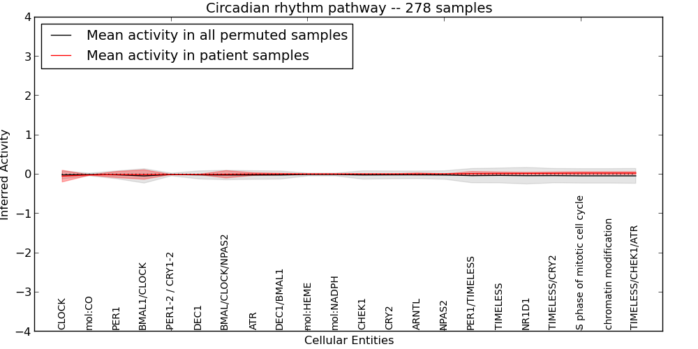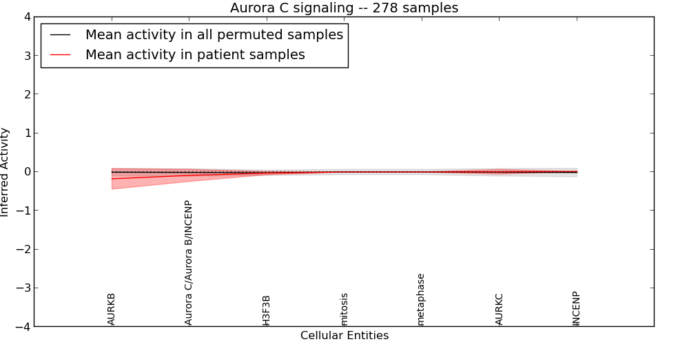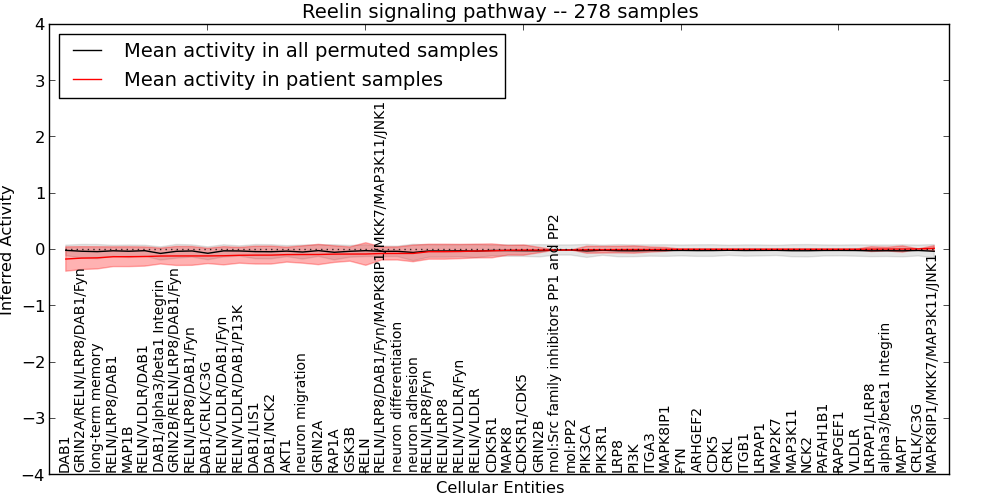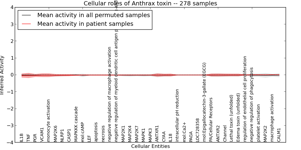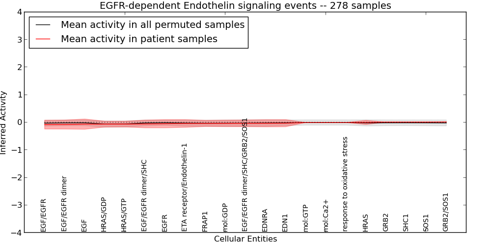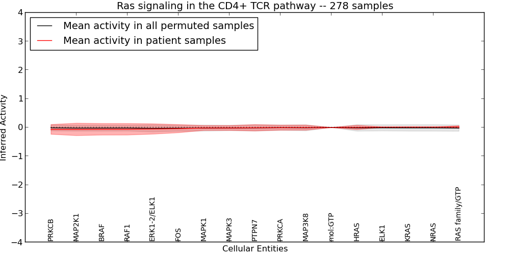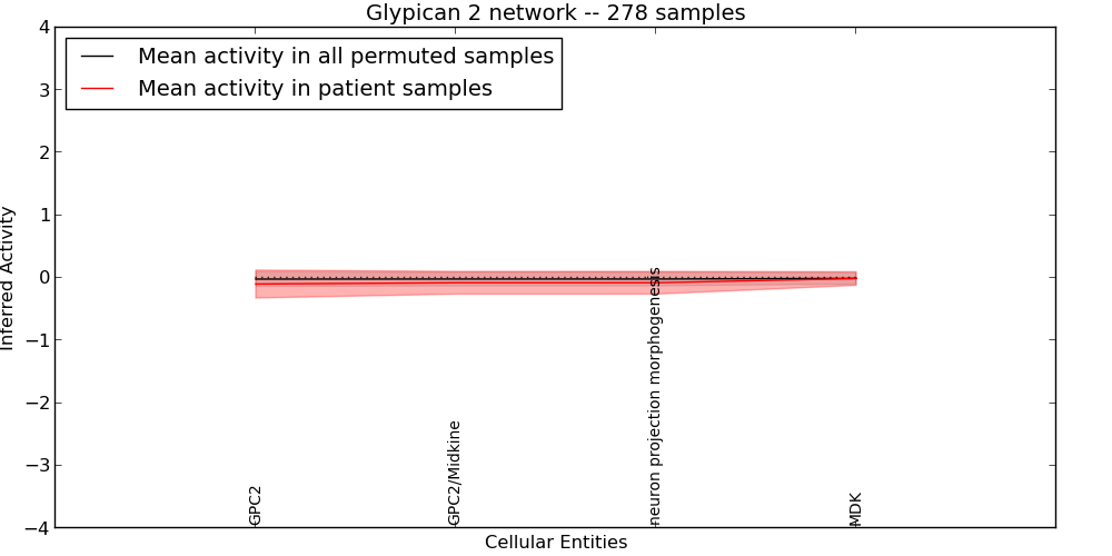 Figure S131.  Get High-res Image This plot shows pathway concept perturbations across all samples against a permutation model. The concepts along the x-axis are sorted by lowest to highest mean activity for the real patient samples. Mean inferred activities are plotted along the y-axis as a colored band showing the average level and one standard deviation range. Real samples are shown in red and permuted samples in black.