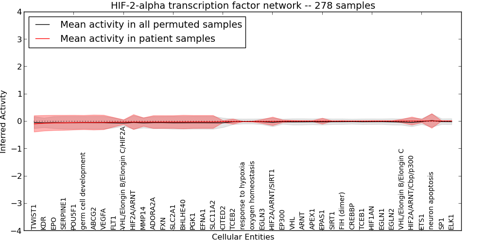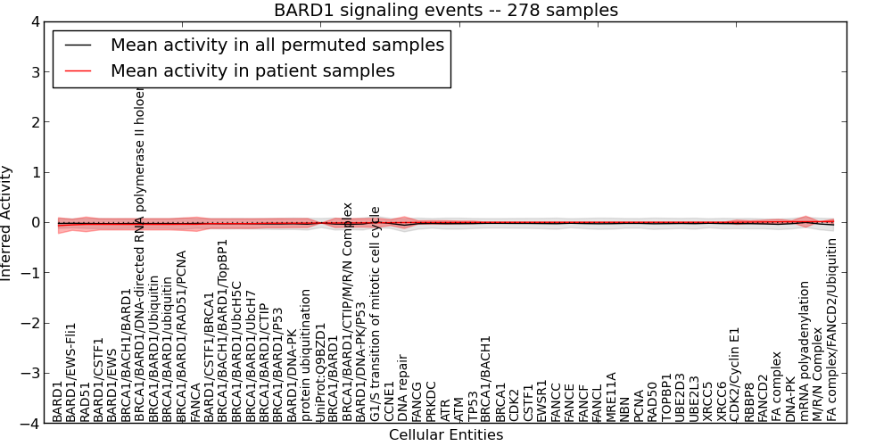 Figure S130.  Get High-res Image This plot shows pathway concept perturbations across all samples against a permutation model. The concepts along the x-axis are sorted by lowest to highest mean activity for the real patient samples. Mean inferred activities are plotted along the y-axis as a colored band showing the average level and one standard deviation range. Real samples are shown in red and permuted samples in black.