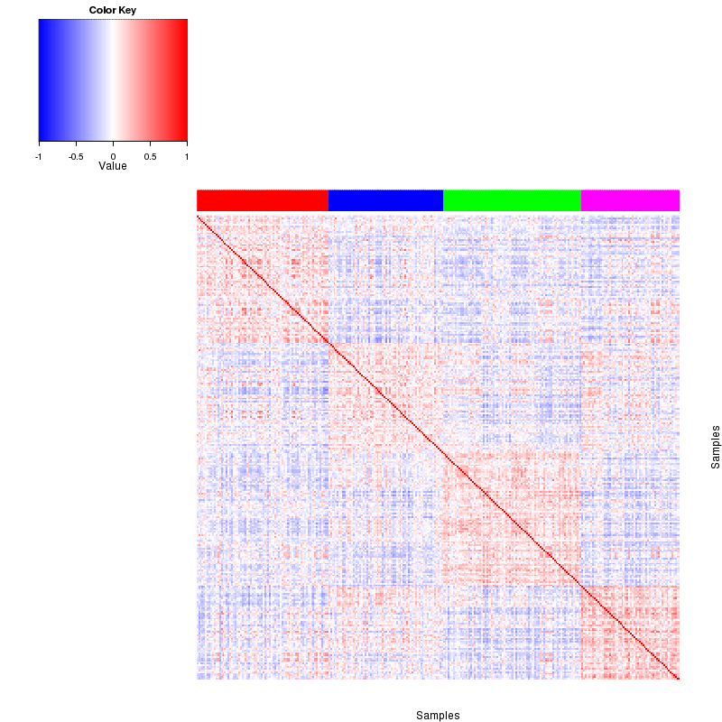 Figure 1.  Get High-res Image Samples were separated into 4 clusters. Shown are 278 samples and 1200 marker genes. The color bar of the row indicates the marker genes for the corresponding cluster.