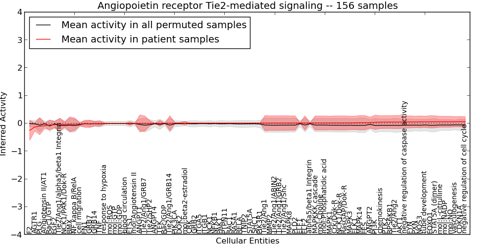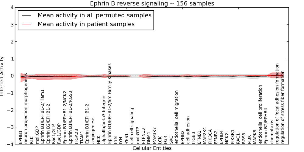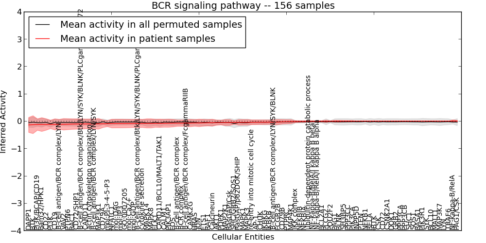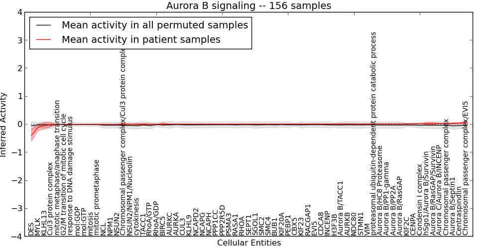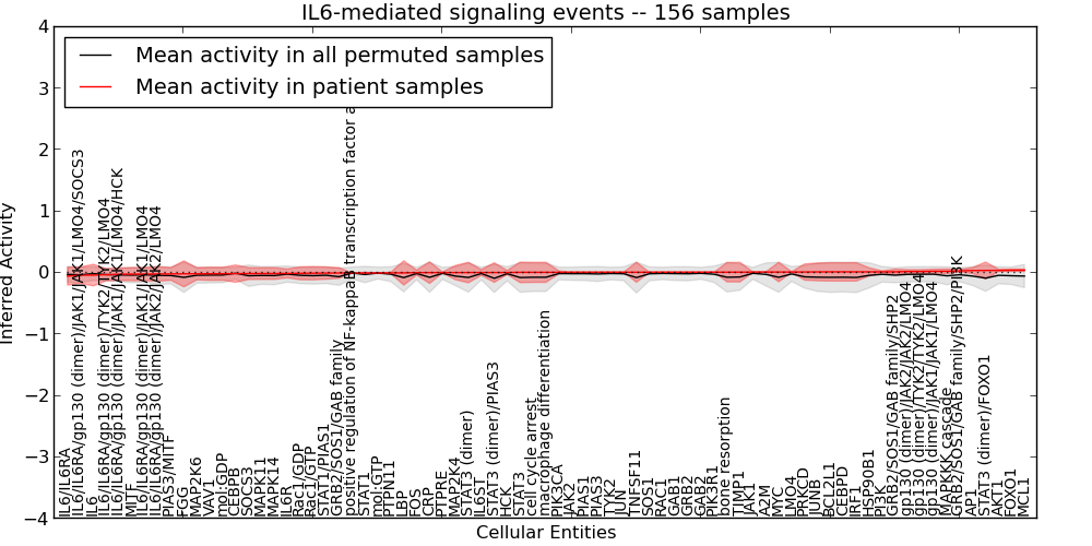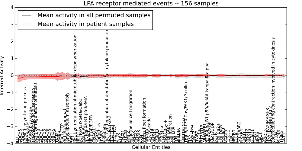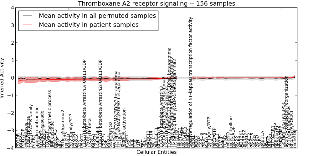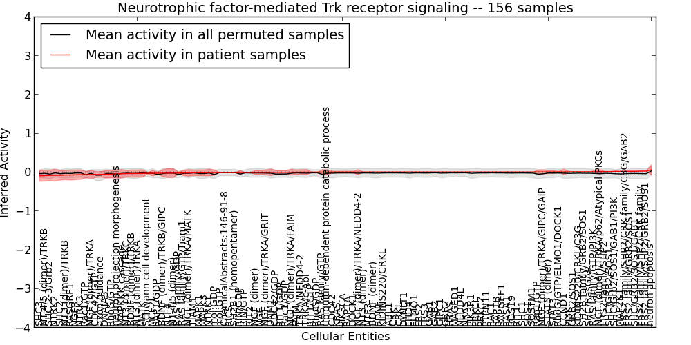 Figure S131. Get High-res Image This plot shows pathway concept perturbations across all samples against a permutation model. The concepts along the x-axis are sorted by lowest to highest mean activity for the real patient samples. Mean inferred activities are plotted along the y-axis as a colored band showing the average level and one standard deviation range. Real samples are shown in red and permuted samples in black.