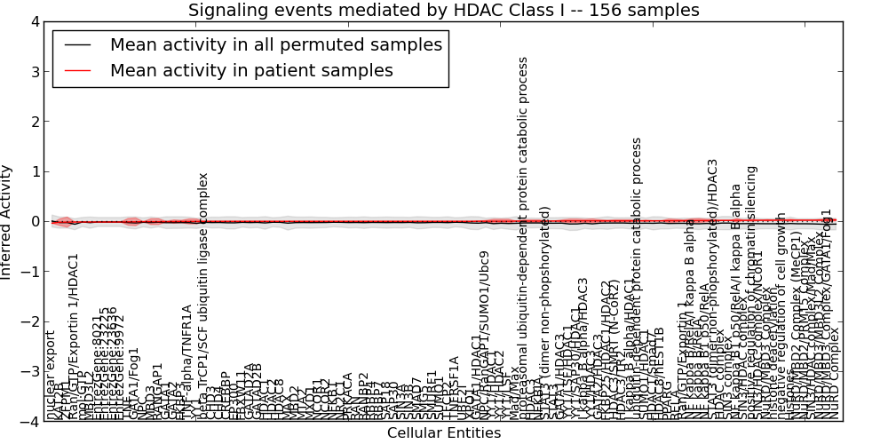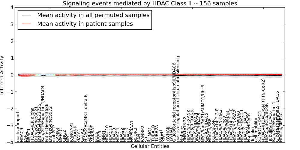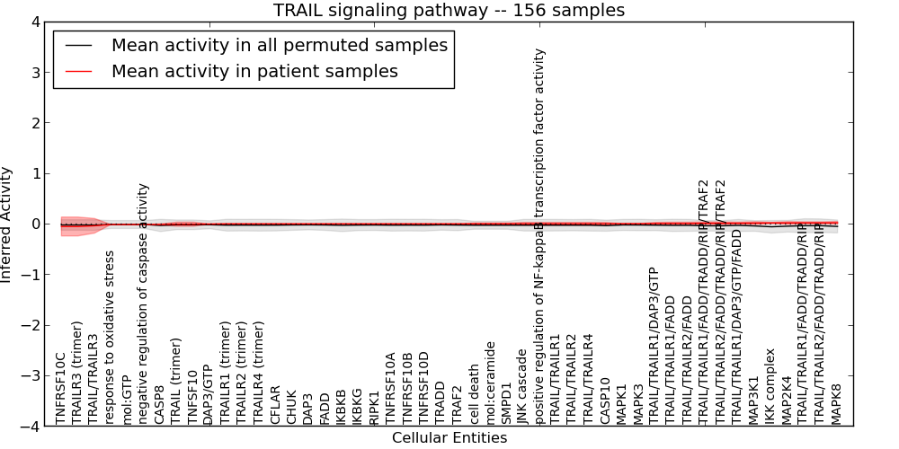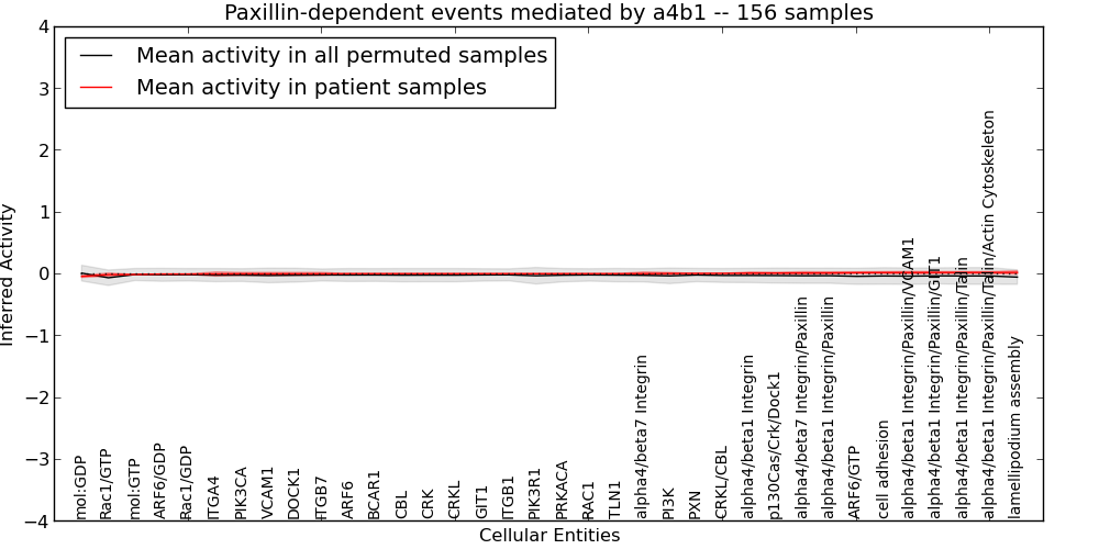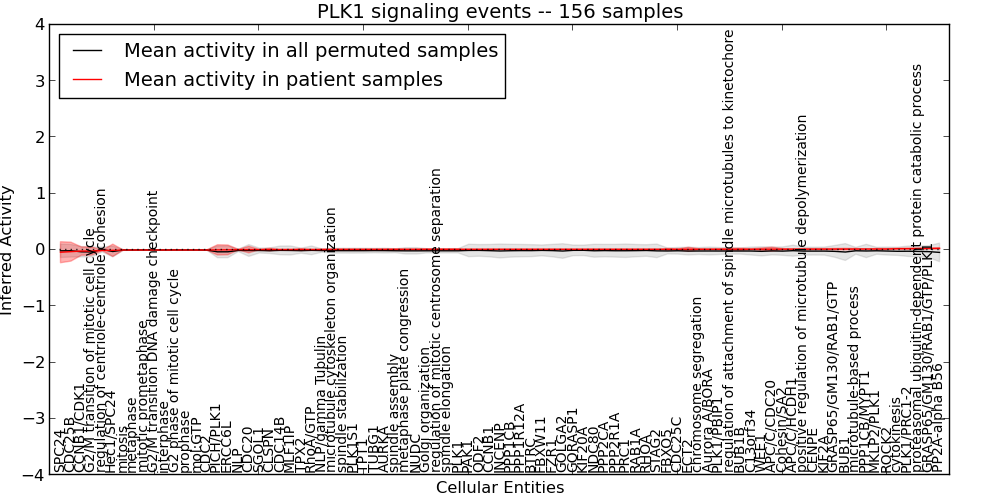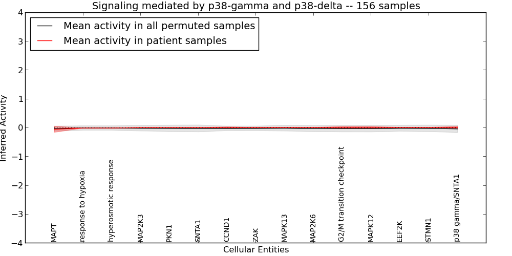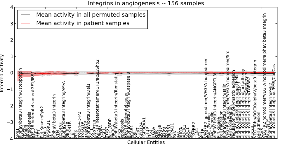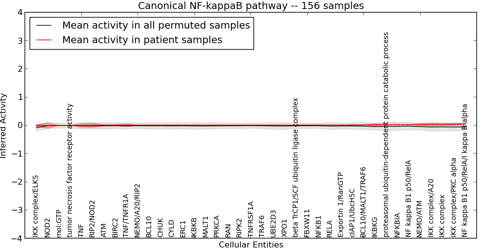 Figure S131. Get High-res Image This plot shows pathway concept perturbations across all samples against a permutation model. The concepts along the x-axis are sorted by lowest to highest mean activity for the real patient samples. Mean inferred activities are plotted along the y-axis as a colored band showing the average level and one standard deviation range. Real samples are shown in red and permuted samples in black.
