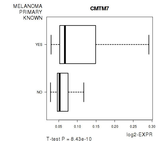 Figure S5. Get High-res Image As an example, this figure shows the association of CMTM7 to 'MELANOMA.PRIMARY.KNOWN'. P value = 8.43e-10 with T-test analysis.