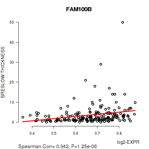 Figure S6. Get High-res Image As an example, this figure shows the association of FAM100B to 'BRESLOW.THICKNESS'. P value = 1.25e-06 with Spearman correlation analysis. The straight line presents the best linear regression.