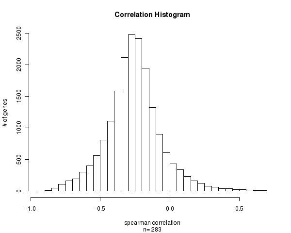 Figure 1. Histogram of methylation correlation values. n is the number of matched samples between Level 3 CpG site methylation and Level 3 gene expression arrays. Number of Matched Samples = 283