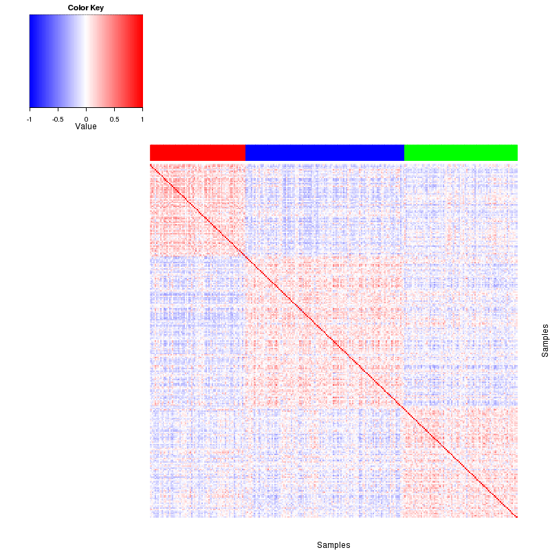 Figure 1.  Get High-res Image Samples were separated into 3 clusters. Shown are 283 samples and 900 marker genes. The color bar of the row indicates the marker genes for the corresponding cluster.