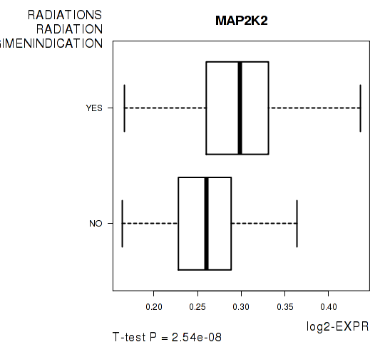 Figure S3. Get High-res Image As an example, this figure shows the association of MAP2K2 to 'RADIATIONS.RADIATION.REGIMENINDICATION'. P value = 2.54e-08 with T-test analysis.
