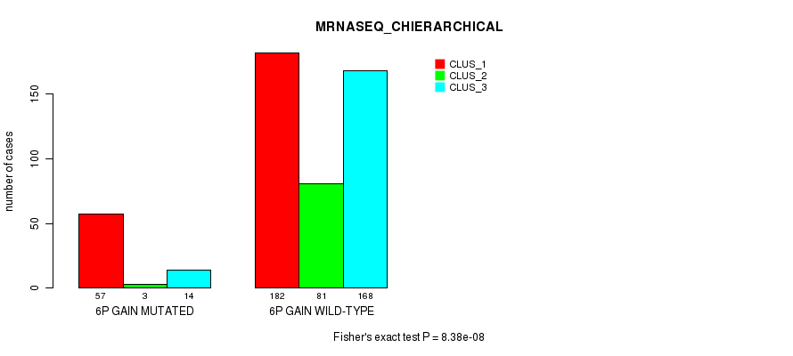 6p gain cnv correlated to 'CN_CNMF', 'METHLYATION_CNMF', 'MRNASEQ_CNMF', 'MRNASEQ_CHIERARCHICAL', 'MIRSEQ_CNMF', and 'MIRSEQ_CHIERARCHICAL'.