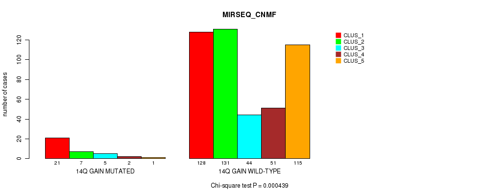 14q gain cnv correlated to 'CN_CNMF', 'MRNASEQ_CNMF', 'MRNASEQ_CHIERARCHICAL', and 'MIRSEQ_CNMF'.