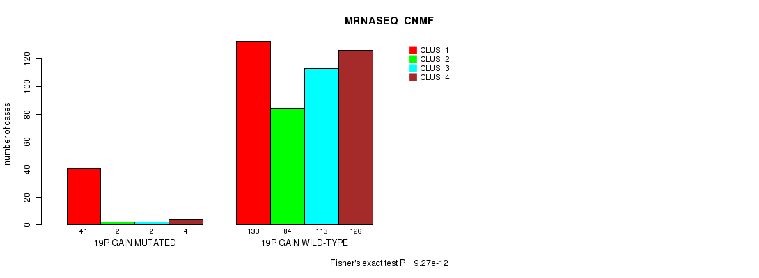 19p gain cnv correlated to 'CN_CNMF', 'MRNASEQ_CNMF', 'MRNASEQ_CHIERARCHICAL', 'MIRSEQ_CNMF', and 'MIRSEQ_CHIERARCHICAL'.