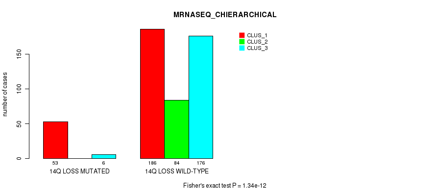 14q loss cnv correlated to 'MRNA_CHIERARCHICAL', 'CN_CNMF', 'METHLYATION_CNMF', 'MRNASEQ_CNMF', 'MRNASEQ_CHIERARCHICAL', 'MIRSEQ_CNMF', 'MIRSEQ_CHIERARCHICAL', 'MIRSEQ_MATURE_CNMF', and 'MIRSEQ_MATURE_CHIERARCHICAL'.