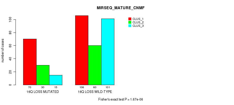 16q loss cnv correlated to 'MRNA_CHIERARCHICAL', 'CN_CNMF', 'METHLYATION_CNMF', 'MRNASEQ_CNMF', 'MRNASEQ_CHIERARCHICAL', 'MIRSEQ_CNMF', 'MIRSEQ_CHIERARCHICAL', 'MIRSEQ_MATURE_CNMF', and 'MIRSEQ_MATURE_CHIERARCHICAL'.