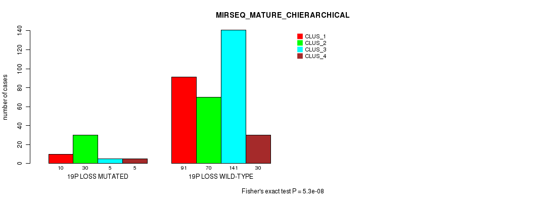 19p loss cnv correlated to 'CN_CNMF', 'METHLYATION_CNMF', 'MRNASEQ_CNMF', 'MRNASEQ_CHIERARCHICAL', 'MIRSEQ_CNMF', 'MIRSEQ_CHIERARCHICAL', 'MIRSEQ_MATURE_CNMF', and 'MIRSEQ_MATURE_CHIERARCHICAL'.